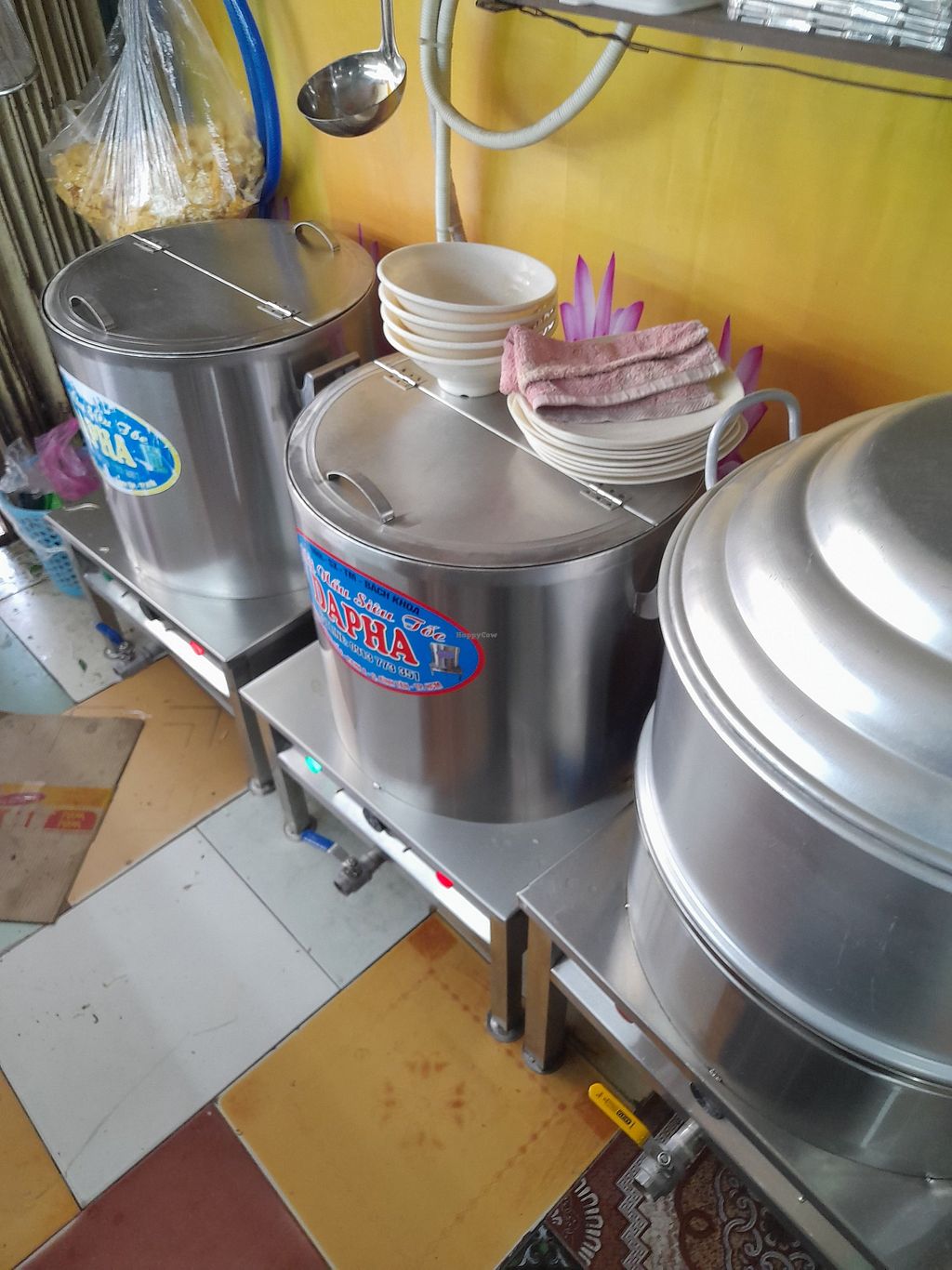 Big pots with rice and broths