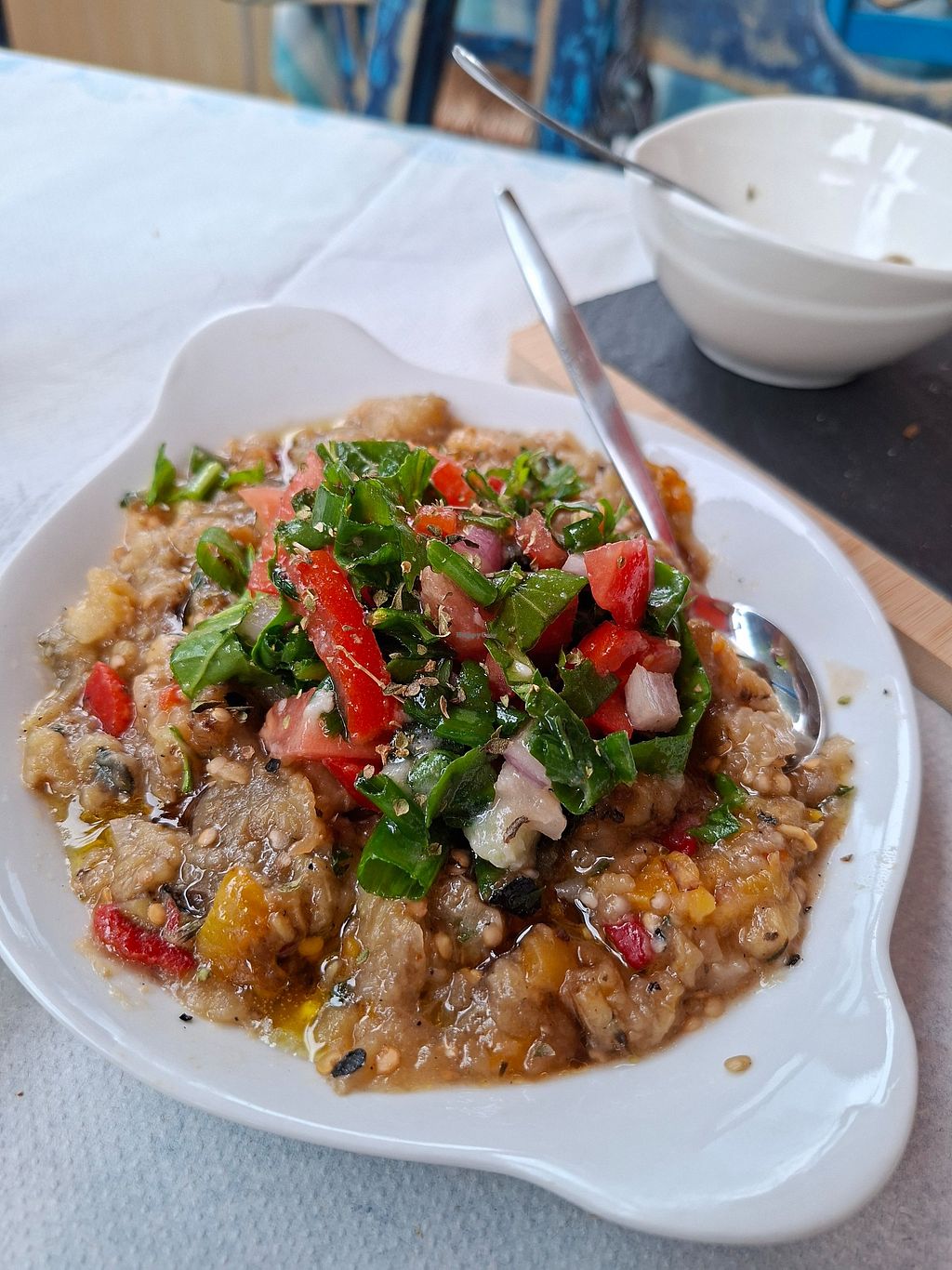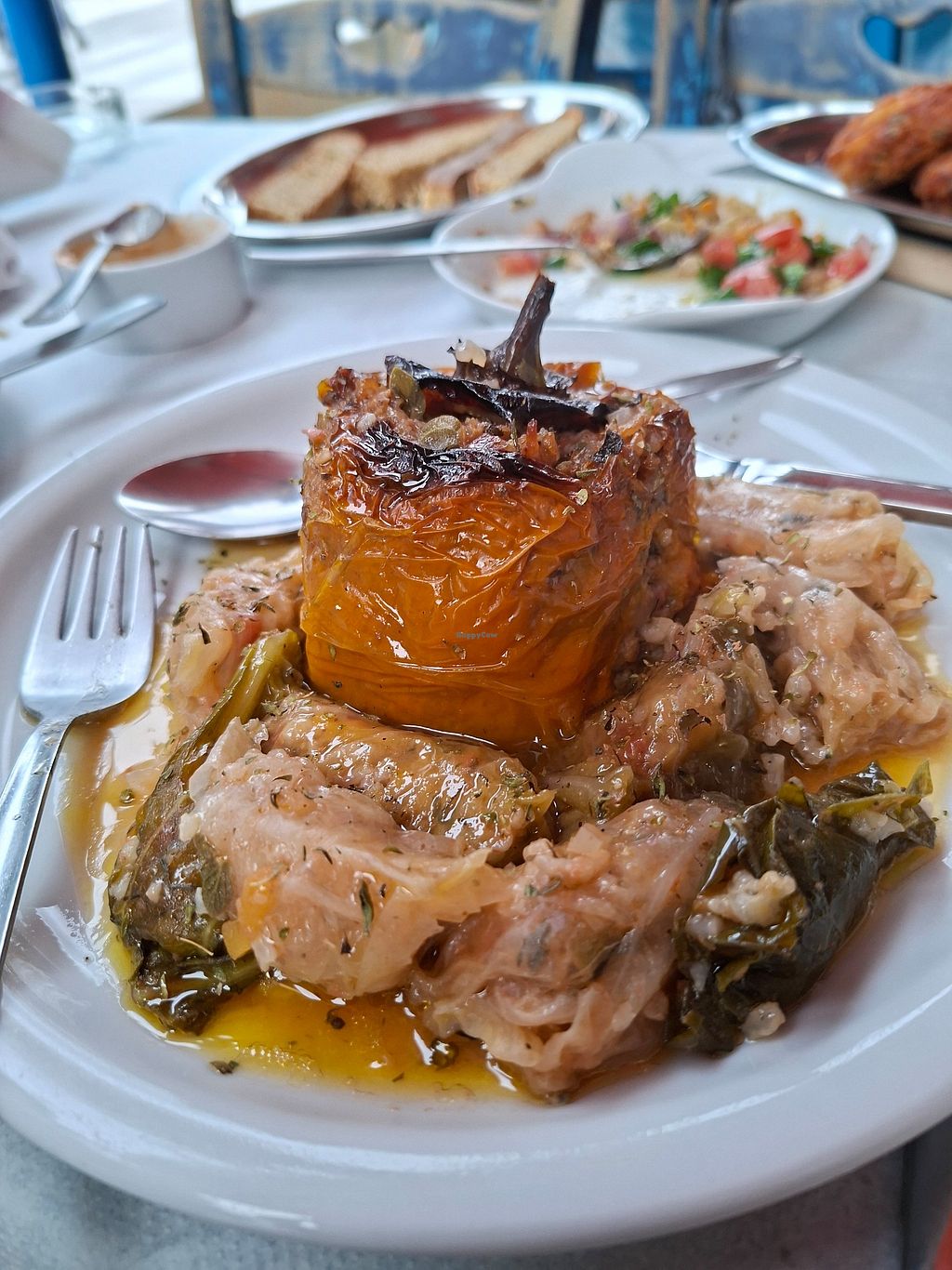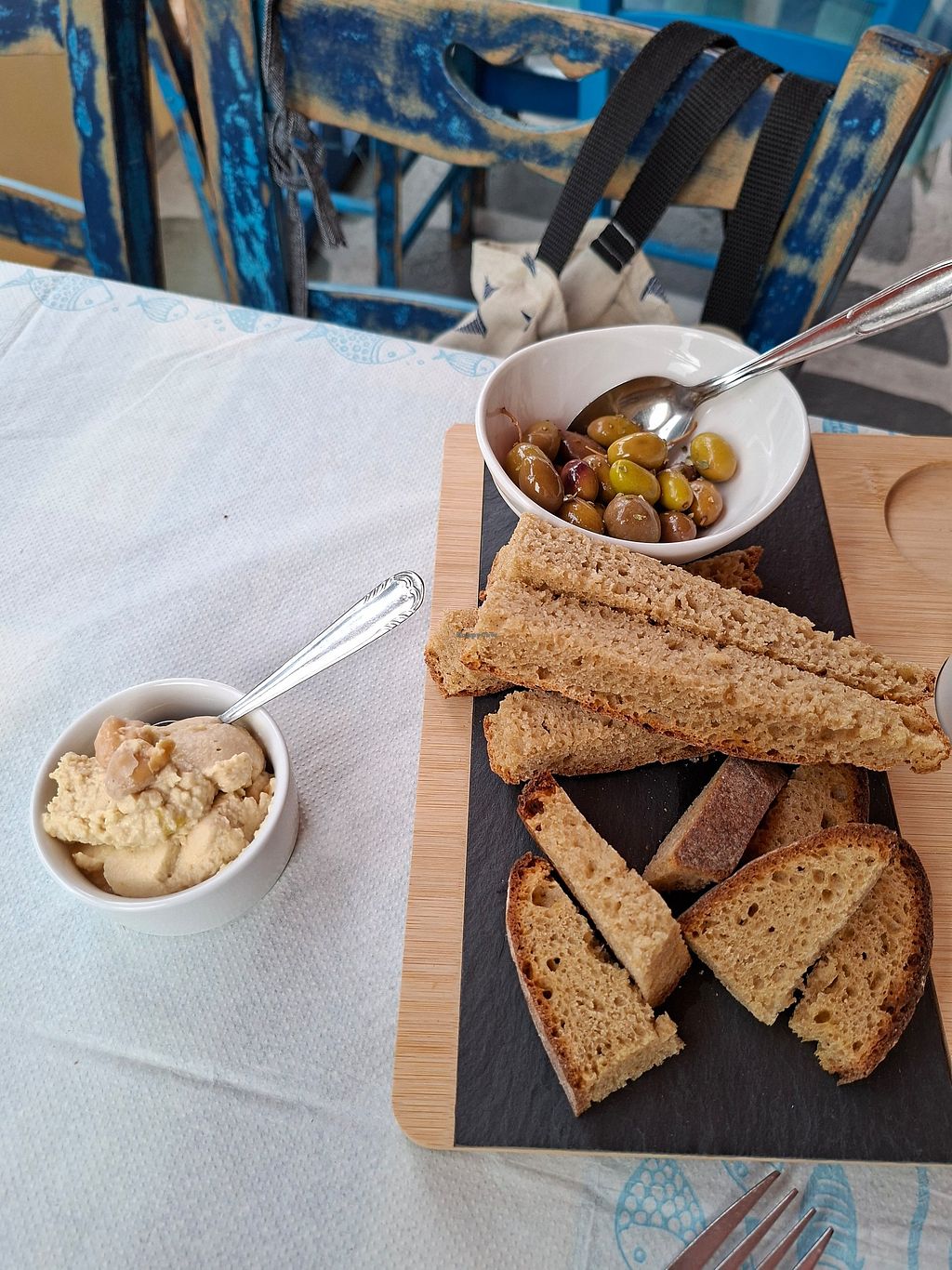 Serves meat, vegan options available. Restaurant offering vegan dishes such as homemade spinach pie, bread with various toppings and sauces, eggplant salad, pitaroudia, stuffed zucchini flowers, stuffed vine leaves, salad, and French fries. Allows dogs. Open Mon-Sun 7:00am-11:30pm.