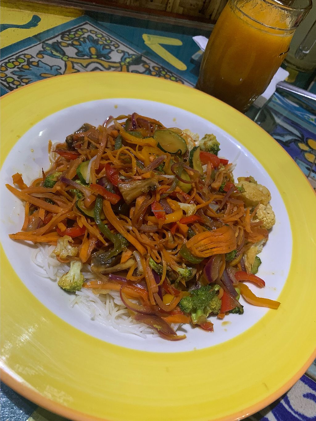 We only got one dish here for takeaway because it's pretty pricey. The veggie stirfry over rice noodles ($4.50) was tasty and loaded with good veggies you rarely see in LatAm restaurants, although my wife thought it was a bit bland. They also have veggie lasagna I wanted to try, but at $6.50 a pop, I couldn't justify it, not when you can get two lunches for $4 around the corner. The place is fairly cute and the people who work there are extremely friendly. They also have blueberry pancakes, burritos and other American stuff (yes, burritos are American).