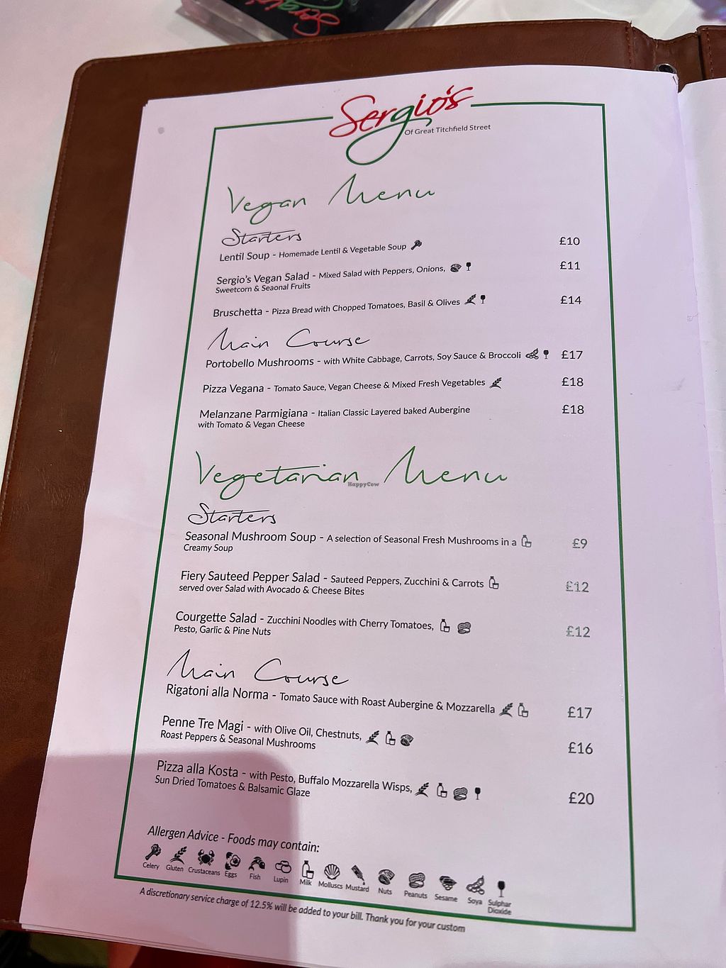 Serves meat, vegan options available. Italian restaurant offering a dedicated page of vegan options, including vegan pasta dishes, vegan lentil soup, vegan 'Sergio’s' salad, and vegan pizza with vegan cheese. Also serves vegan desserts. Open Mon-Sun 12:00-11:30.