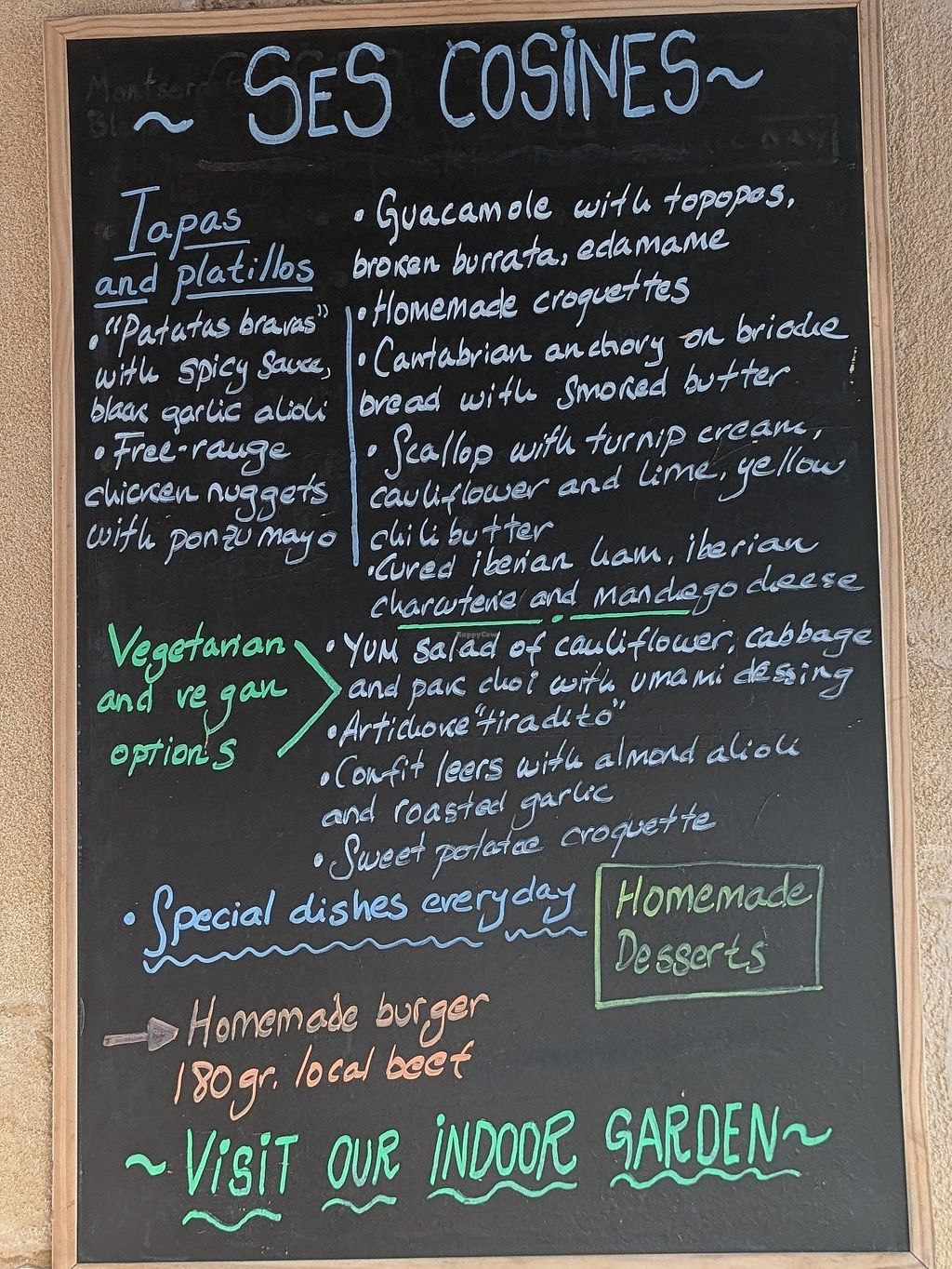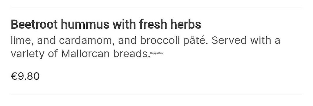 They had a good few vegan tapas options including beetroot hummus, leeks, artichoke, and patatas bravas. Not much in the way of protein but the dishes are beautifully presented. There's one dessert, a toffee and apple cake which was a little underwhelming but perfectly fine. Definitely better than most Mallorcan restaurants for options and in a pretty street with outdoor seating near the main square.
