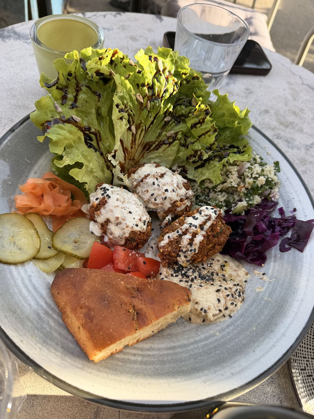 We had the falafel bowl and the cheesecake and both were excellent. The service is super friendly and the terrace is a great spot to have a relaxed meal.