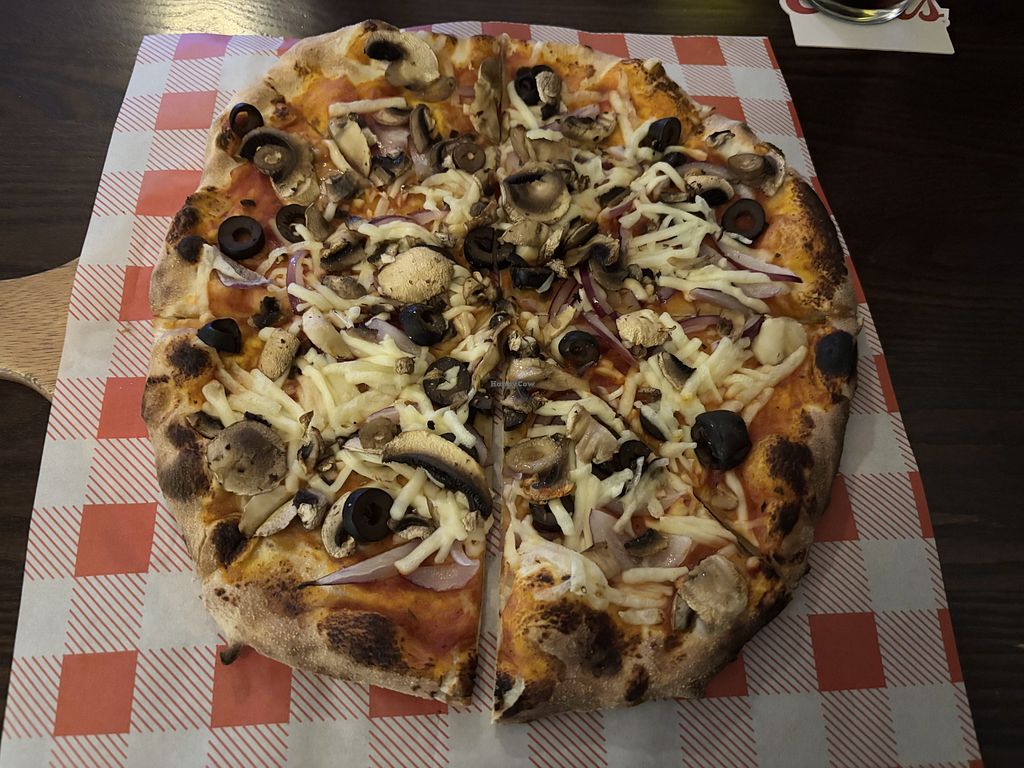 Delicious vegan cheese available. You can order any topping you like.