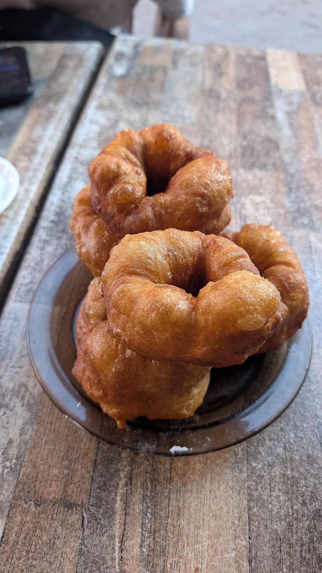 Y recién hechos y calentitos. Lo combinas con un té y se salen. Sencillo pero muy rico. Lo dicho en el título, es como comer una mezcla de churros y donuts, más cercano a lo segundo, muy sabroso. Te ofrecen azúcar y melaza (o miel, no lo tengo claro) lo untas en el azúcar y a gozar. En serio, un veganx no puede perderse esto