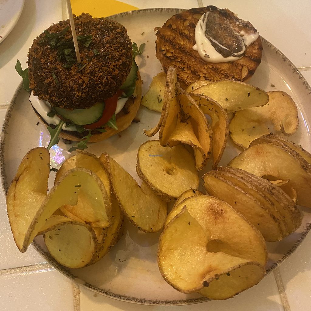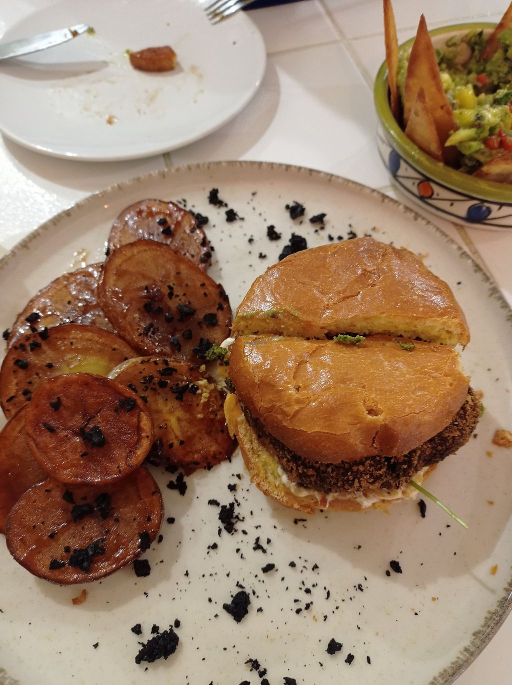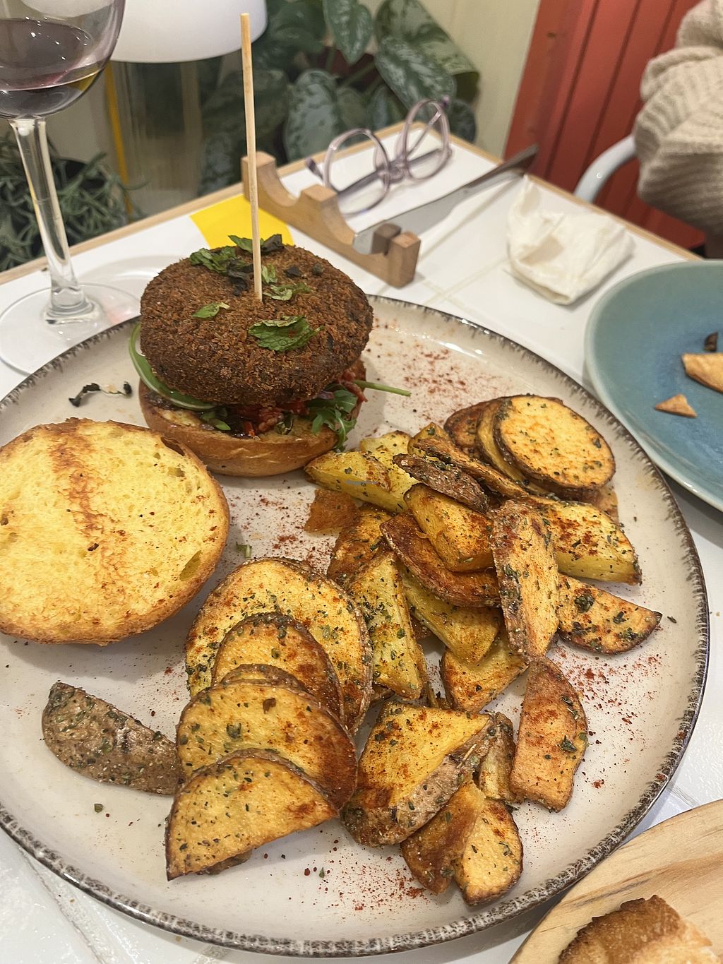 Es la segunda vez que voy, la primera pedí patatas fritas y morteruelo vegetariano y muy rico todo. De postre tiramisú q estaba rico pero no entendí la reconstrucción. Hoy he pedido la hamburguesa veggie (la vi la otra vez que estuve y llevaba con ganas desde entonces) Está superbuena, las patatas me han parecido espectaculares. Hoy se postre torrija, muy rica también.