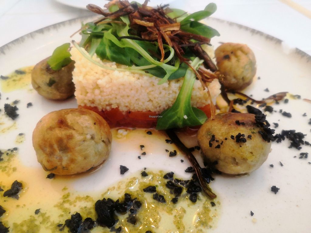 Óscar and his team were so warm, and they went out of their way to make us feel welcome. We shared two dishes, the vegan cheese platter (three types of nut cheese made in Castille-La Mancha, with a local berry jam and fresh strawberries), and eggplant "meatballs" over couscous with a light tomato sauce. Delicious and filling. As others have mentioned, it is located in a non-descript plaza in the new city. When we typed in the name of the restaurant, Google Maps took us there with no problem.