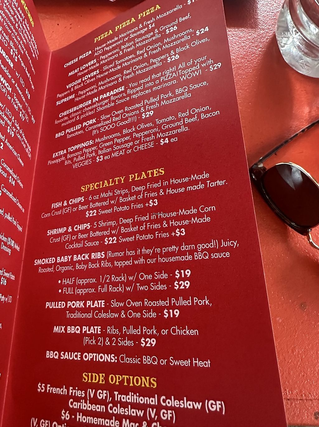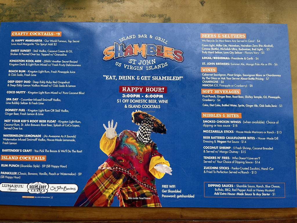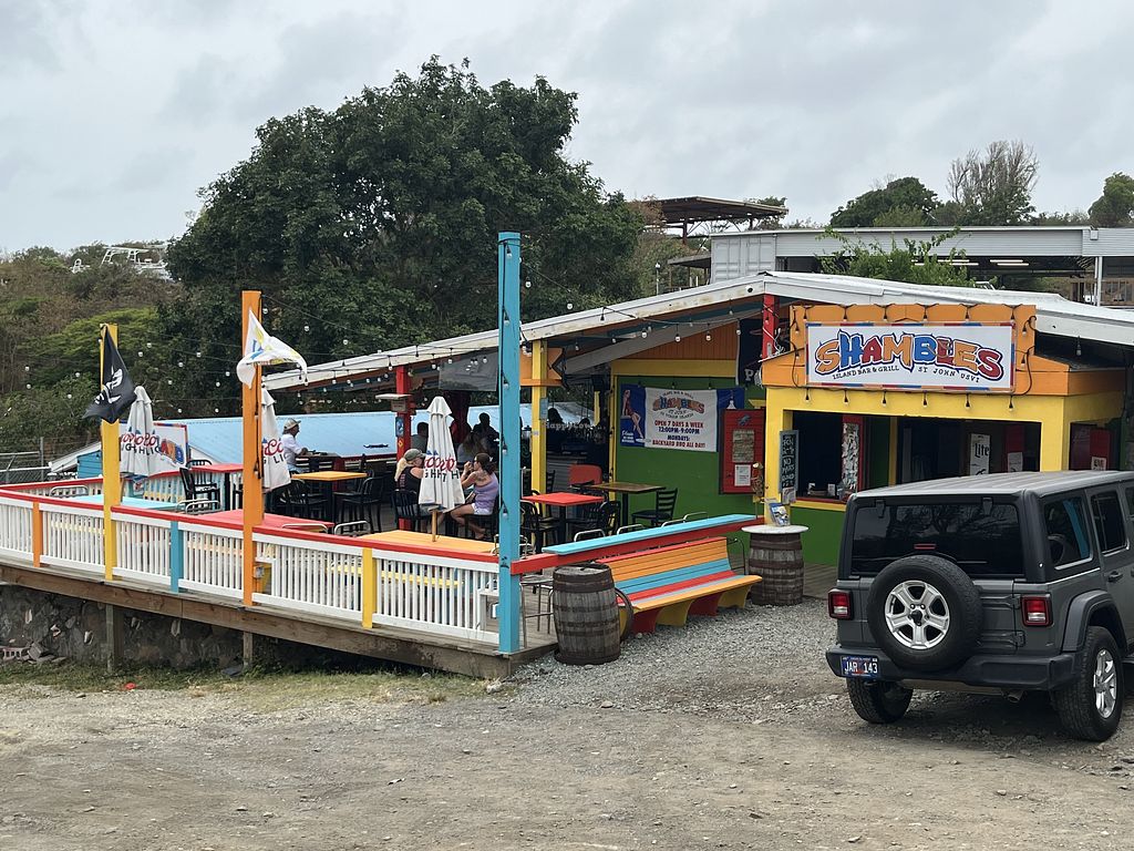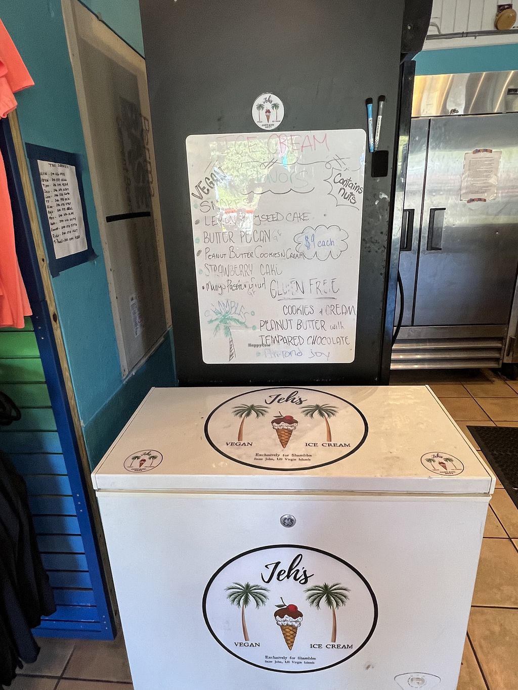 This is a fun, colorful, beachy restaurant with a super cool vibe, with an astoundingly high quality of food - completely unexpected. The chef is vegan (although the restaurant is not) and several options are clearly listed as vegan. THE FOOD IS ALL HOMEMADE, INCLUDING THE SAUCES. Everything from the hot sauce and the house dill dressing (served with the beer-battered cauliflower) to the Roasted Red Pepper Aioli (served with the homemade black bean burger) is homemade. It tastes nothing like what you normally get at restaurants. The black bean burger was above and beyond any black bean burger we have ever tasted, truly in a category all of its own. Next time we go, we'll try the sweet potato burger too. Plan on ordering dessert because they've got about a dozen flavors of VEGAN ICE CREAM, ALL HOMEMADE. This ice cream is so far above and beyond the popular brands (Ben & Jerry's, So Delicious, Oatly, etc.) ... this ice cream is incredible. We got rum raisin and a mocha coffee one - can't remember the actual name. We savored each spoonful, remarking just how good it was compared with anything you can buy in a store. The service is friendly and easy-going. The owner was also helping to serve the night we were there and he chatted with us, telling the story of the restaurant - it's got quite a history - very worthy of patronizing this beachy joint - will definitely make this a priority at each visit to St John.