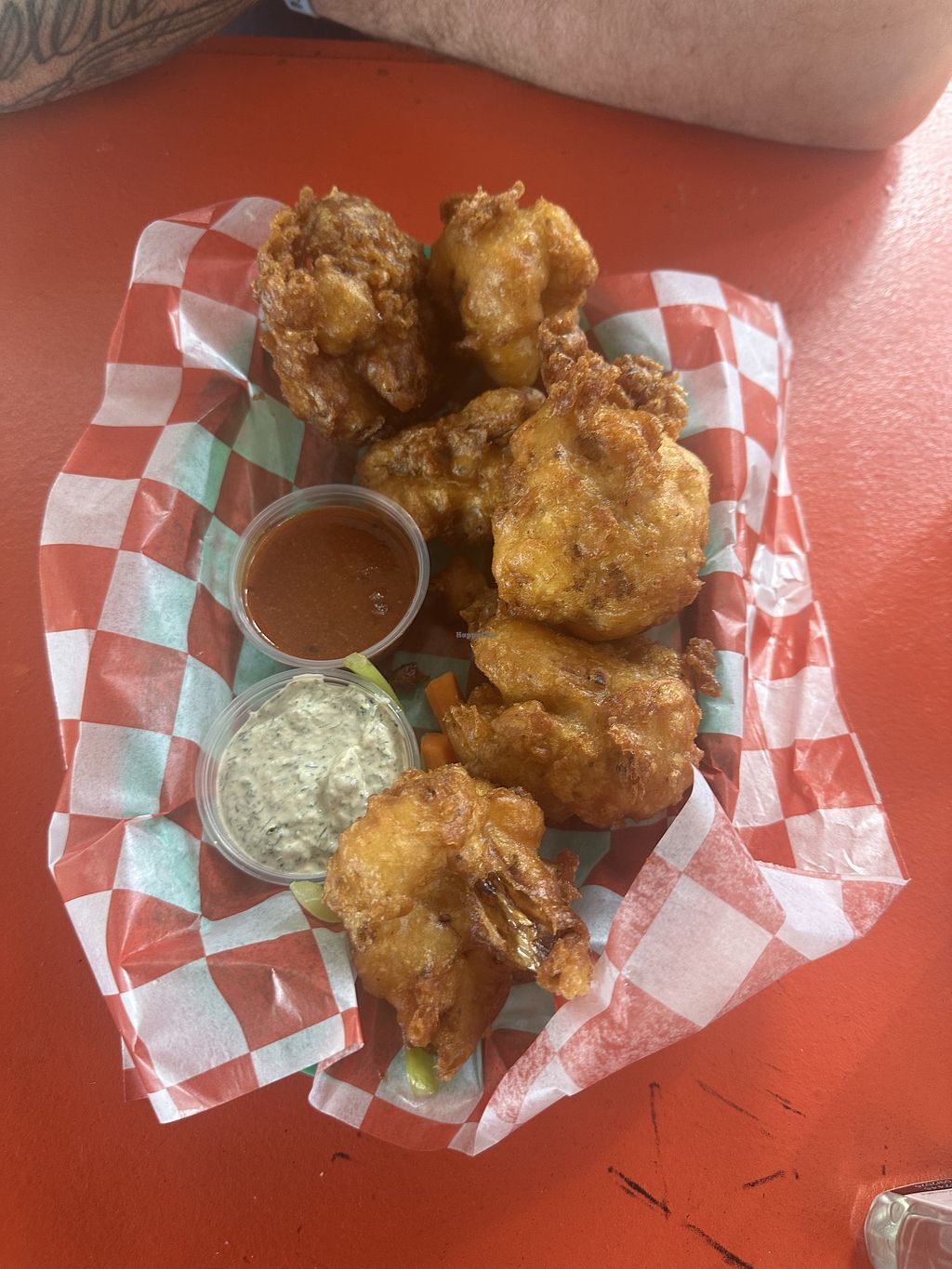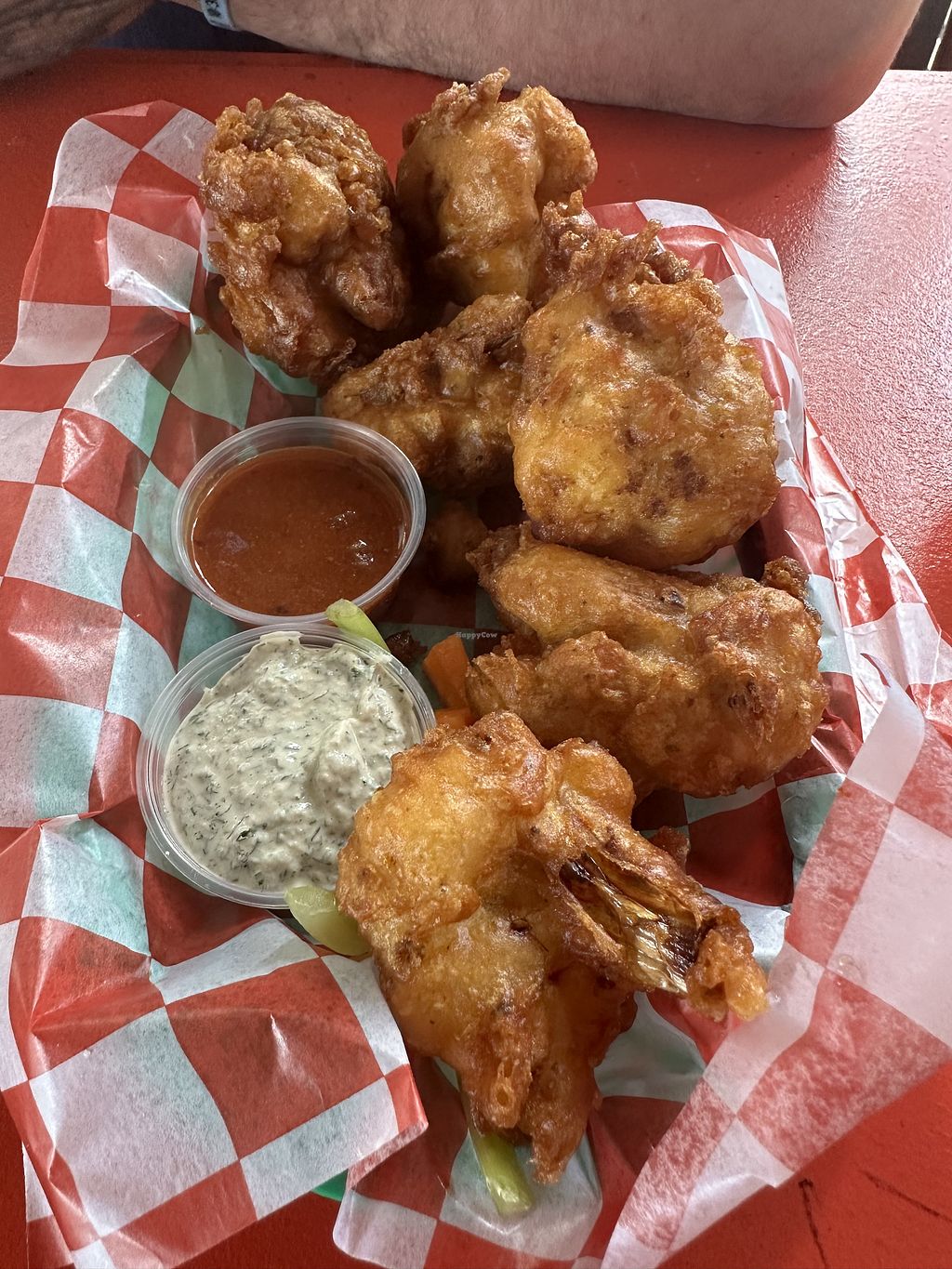 Read moreAs far as food goes, there isn’t much. There is beer battered cauliflower wings with hot sauce and dill dressing. There are 2 veggie burgers that can be made vegan but I was told the bun isn’t vegan.