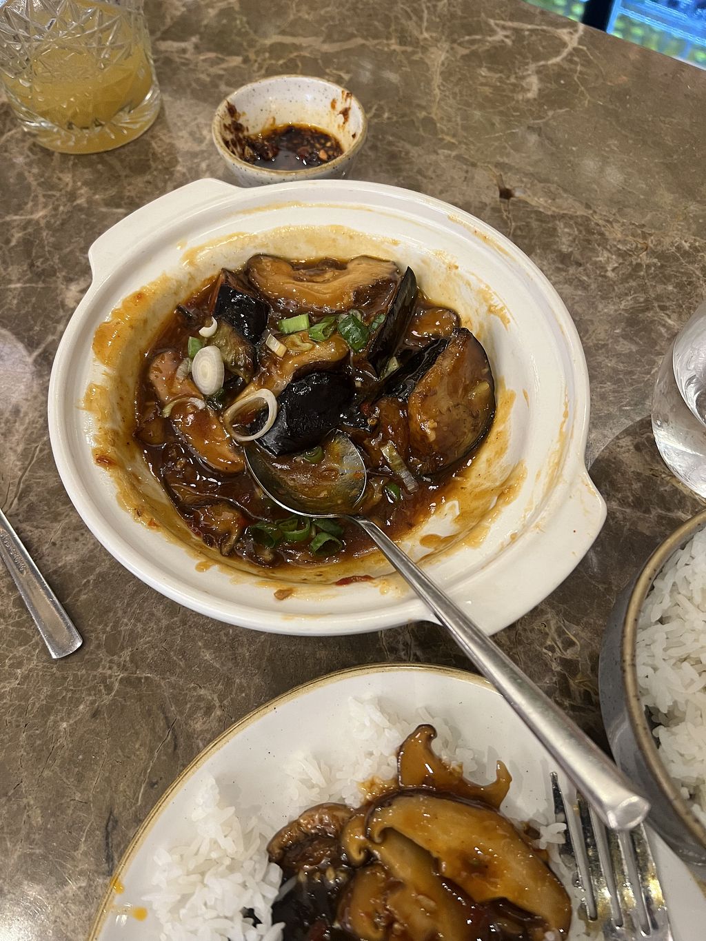 They have three vegan dumpling options and one vegan main. I got the truffle dumplings which were delicious and the aubergine and mushroom clay pot with rice.