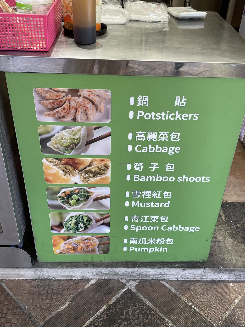 Read moreThey sell pot stickers and five different kinds of stuffed buns (cabbage, bamboo shoots, spoon cabbage, mustard (which means the leaves) and pumpkin). It's perfect to eat right way when the dumplings are still hot, but it's also a good snack for during the day, as the food still tastes yummy when it‘s cold.