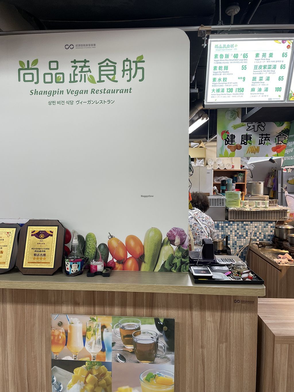 I didn’t expect too much based on other reviews but was pleasantly surprised with the food. The menu is on the side of the stall so we couldn’t see it when we came in and thought they only had 3 options. Found out there was more later. They were sadly out of dumplings when we were there. I ordered the rice dish as I was really craving rice, my partner had the sesame oil noodles. Both dishes were absolutely delicious. The stand shows clearly it’s 100% vegan. No English spoken but with a lot of pointing we figured it out. The cook was very friendly. It’s inside a food court, you can get drinks at one of the other stands.