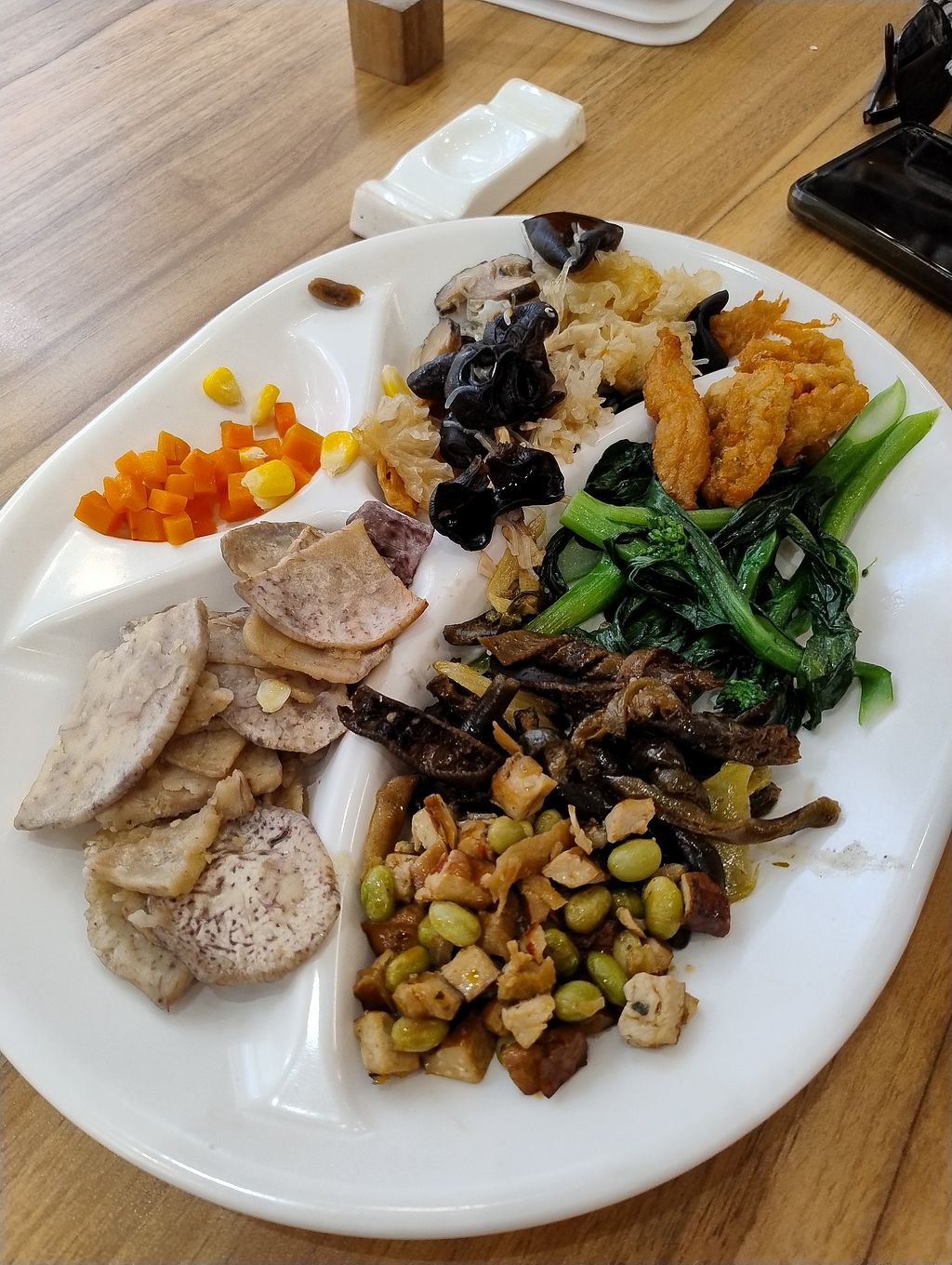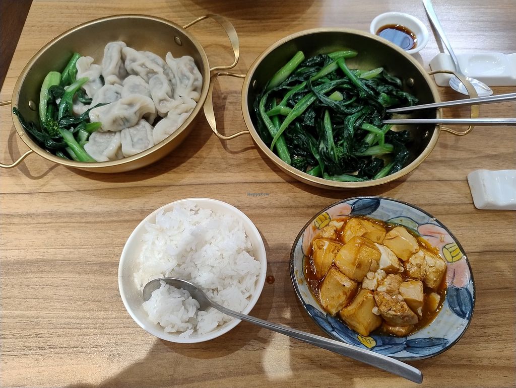 Mapo tofu, dumplings, greens