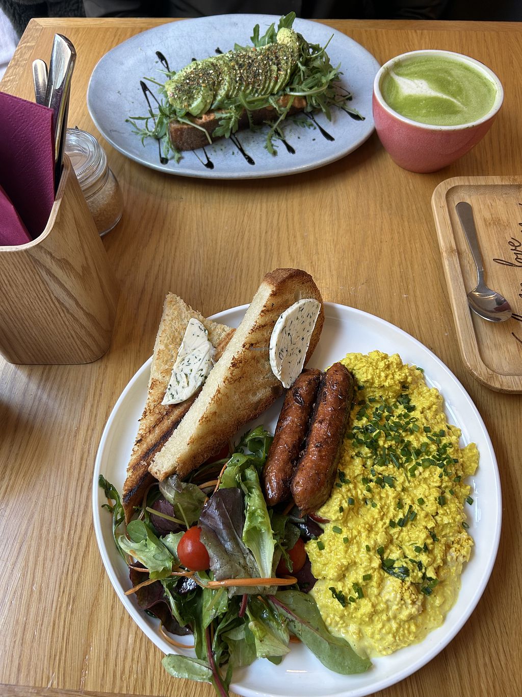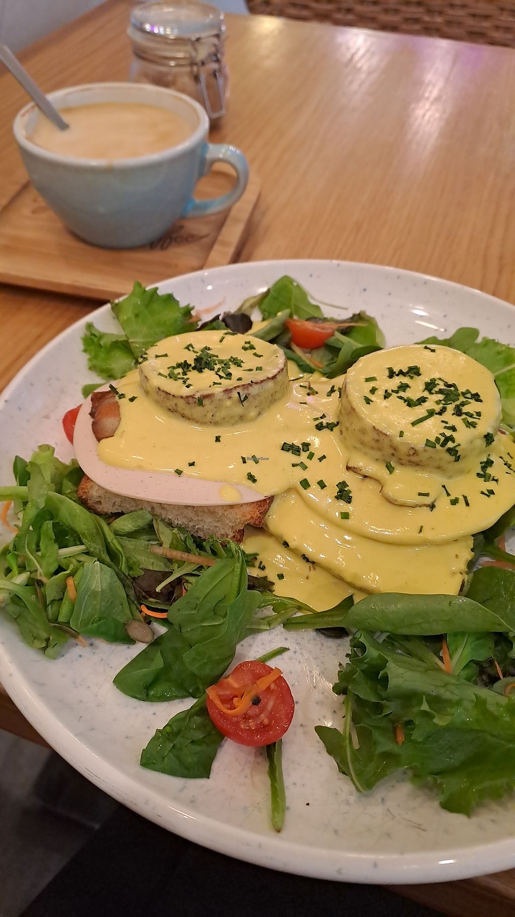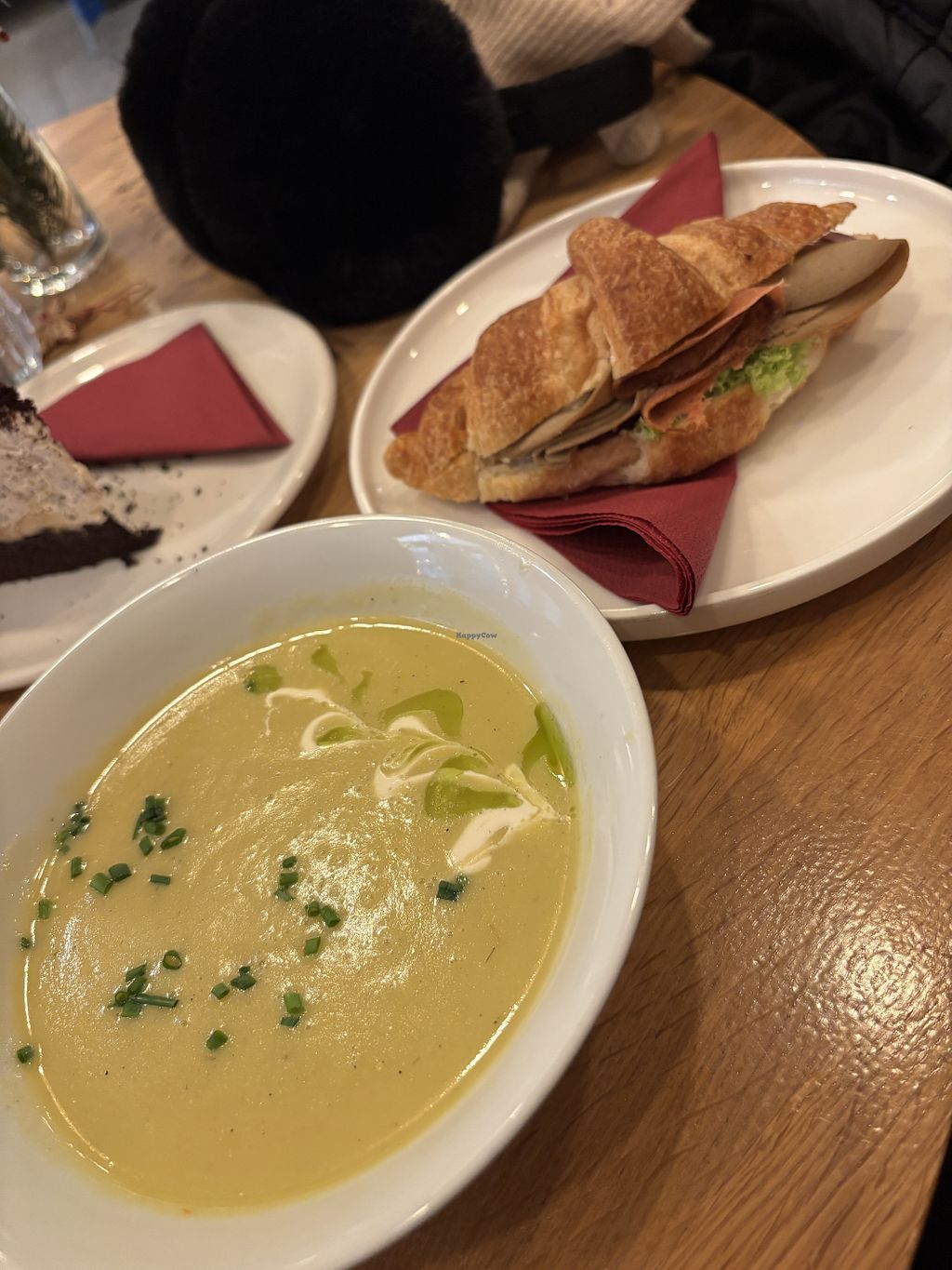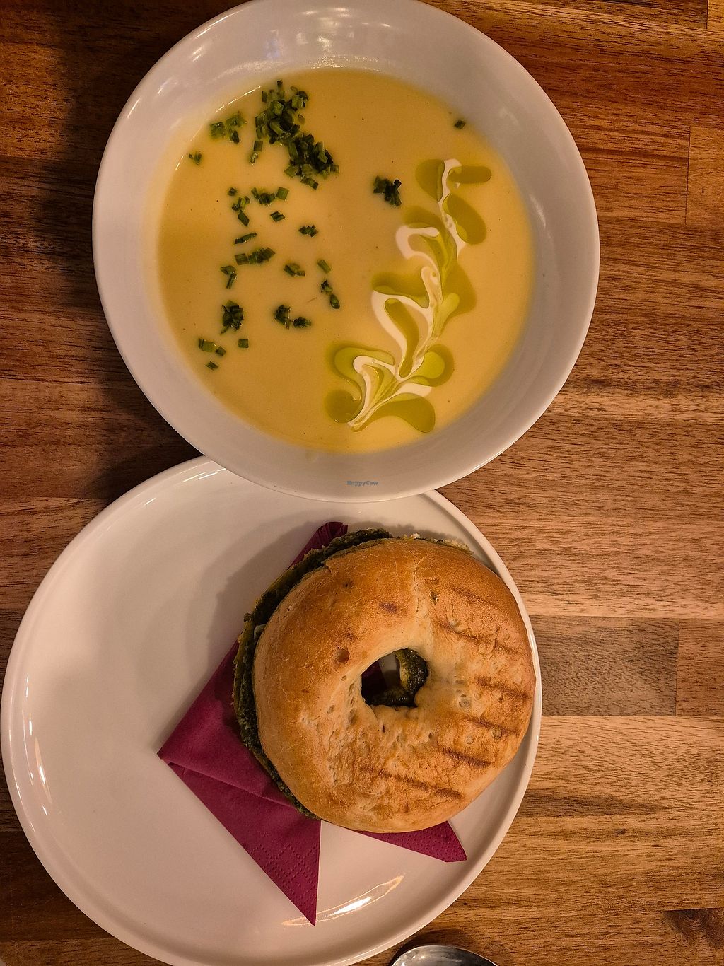 Delicious Cauliflower soup and bagel with pesto and sun dried tomatos.