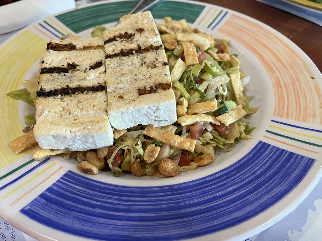 This is such a cool restaurant right on the beach! Great views and a good place to see the sunset. I appreciate that they have vegan options as well! They have tofu as a protein option that you can substitute for meat or seafood. The rice bowls can be made vegan by removing the cheese and sauce. The Ko Tao salad is vegan with tofu. I got the seafood rainforest dish over rice and substituted tofu for the seafood. Decent food!