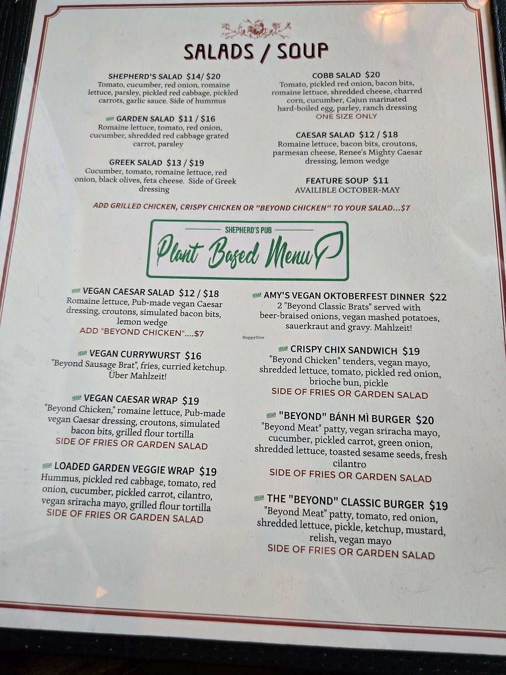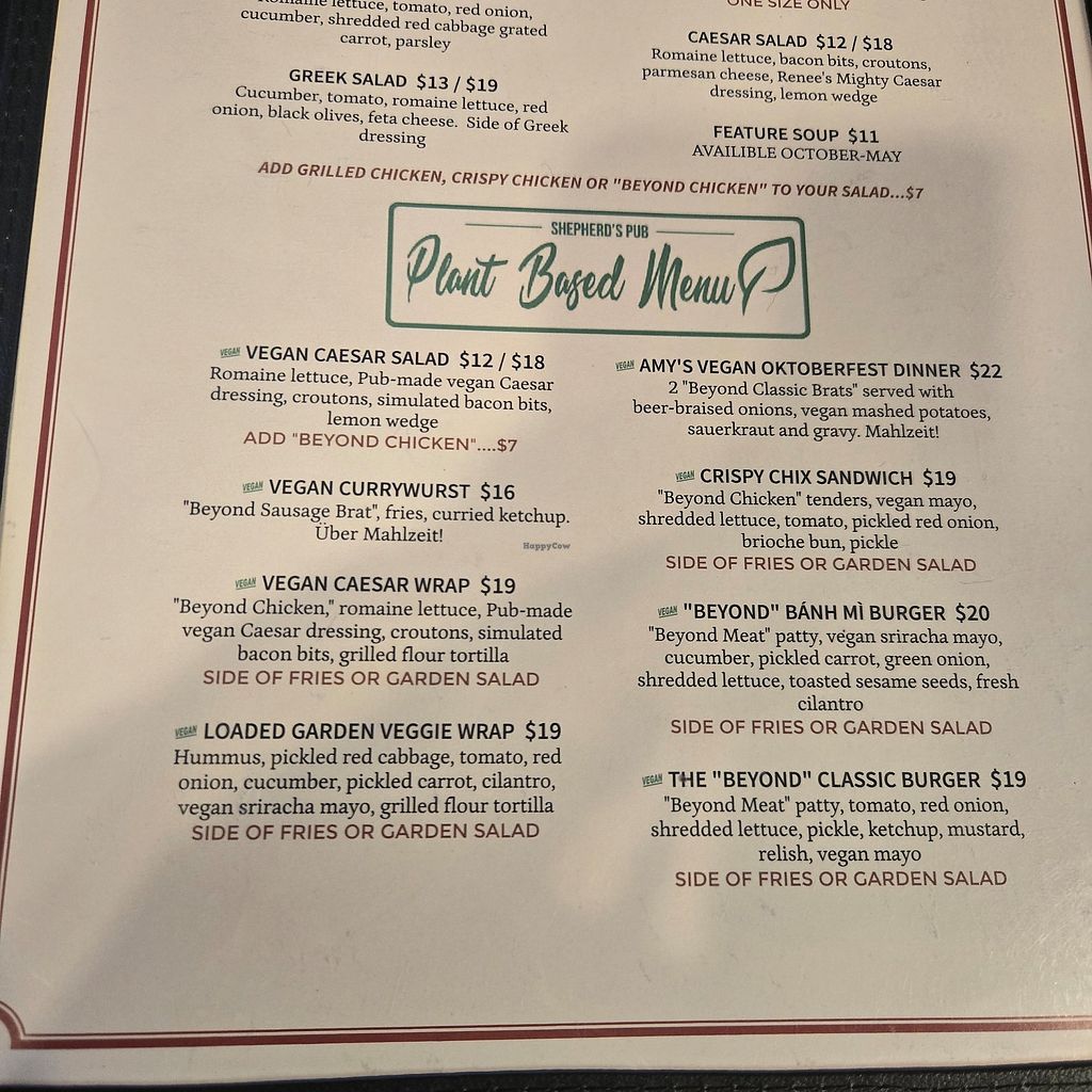 Shepherd's Pub was lovely. They have a full vegan menu that is not just Beyond Burgers! The Oktoberfest Feast was delicious, the onion rings are solid, and the Caesar Salad with chick'n was delish. They were so happy to have people accessing their vegan menu and bent over backwards to make sure we were satisfied. Yes, it is a pub serving pub food but who doesn't love inclusive pub food?