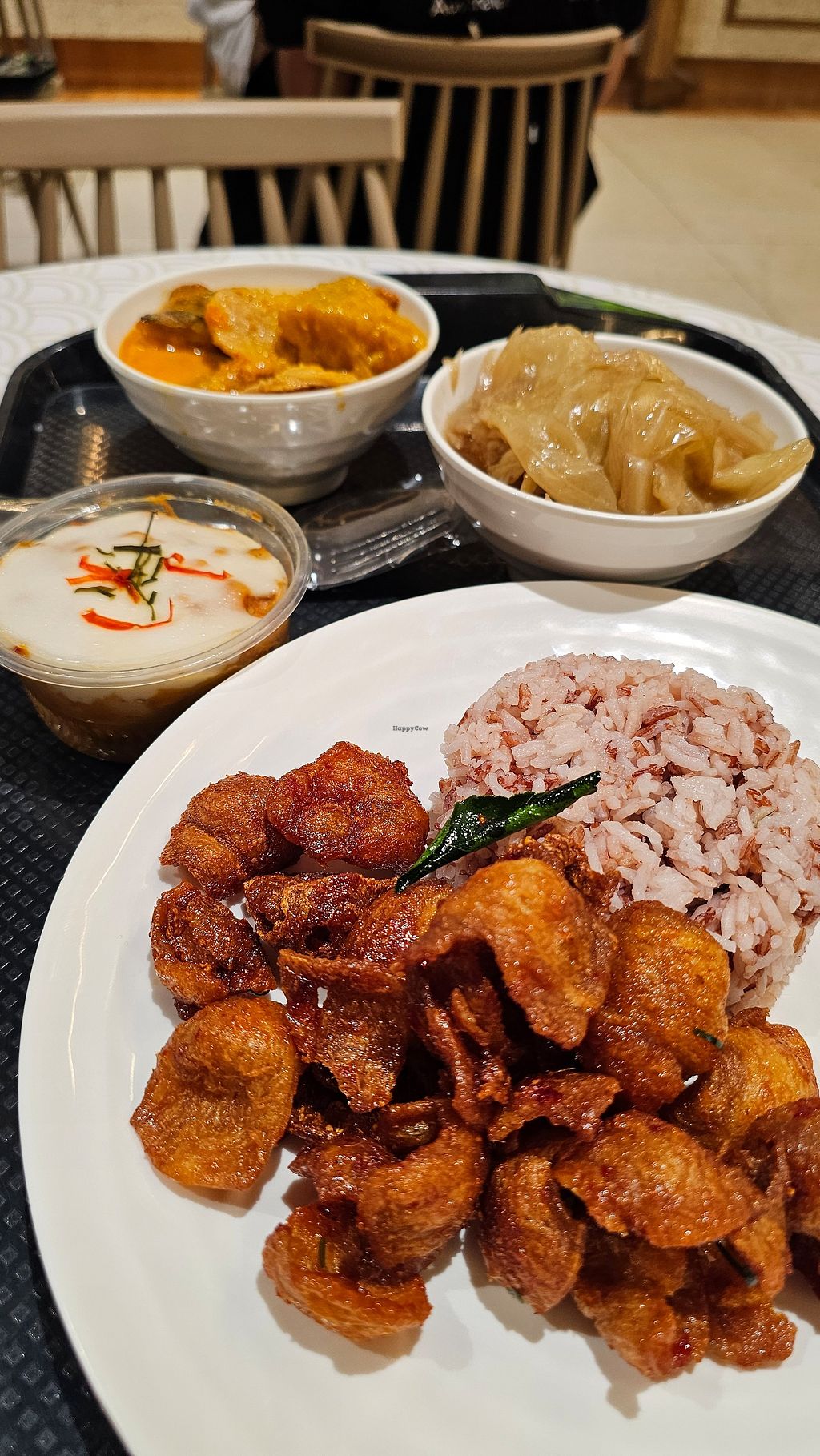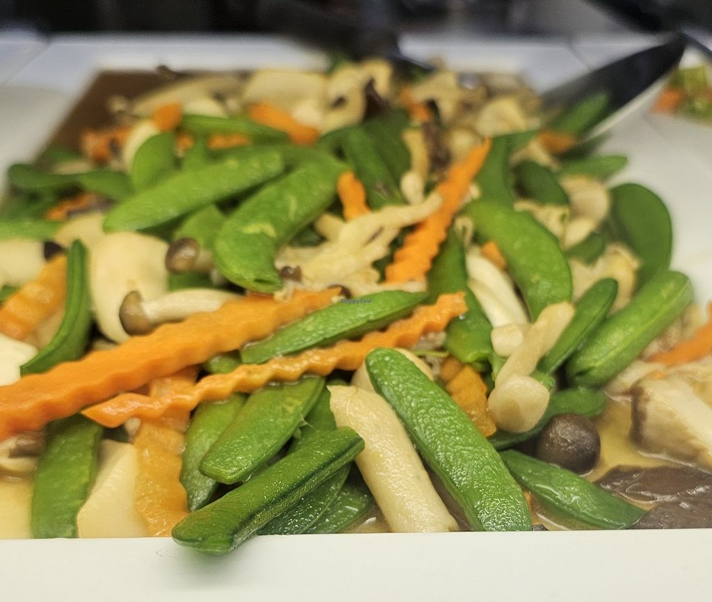 Thai food court vegetarian restaurant where customer picks 3 sides and 1 rice. Curries, stir fries, veggie dishes, fried fake meats, some of which are vegan and others that could possibly be made vegan upon request.