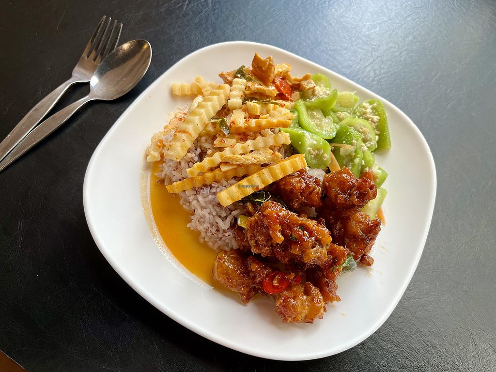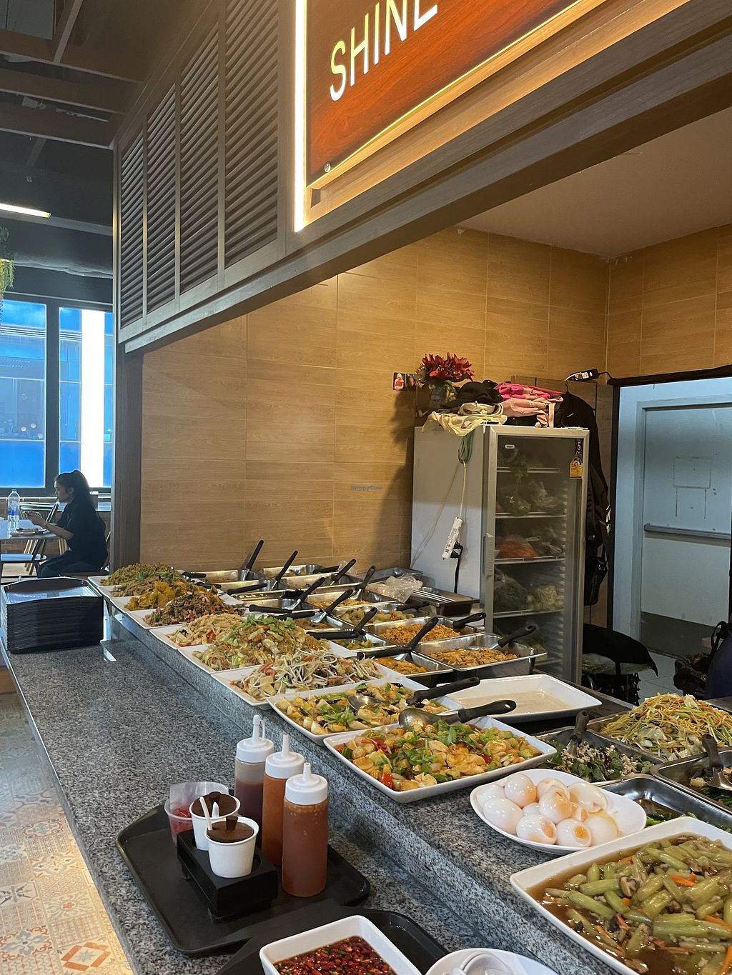 Read moreLocated inside the newly renovated Gaysorn building 4th floor and easy to find. Get a card with money at the food court and present by ordering. 65 thb for three dishes. Recommend the spicy stir fry with mock meat see pic and the crispy things I had. The curry was too sweet. Nice place - easy