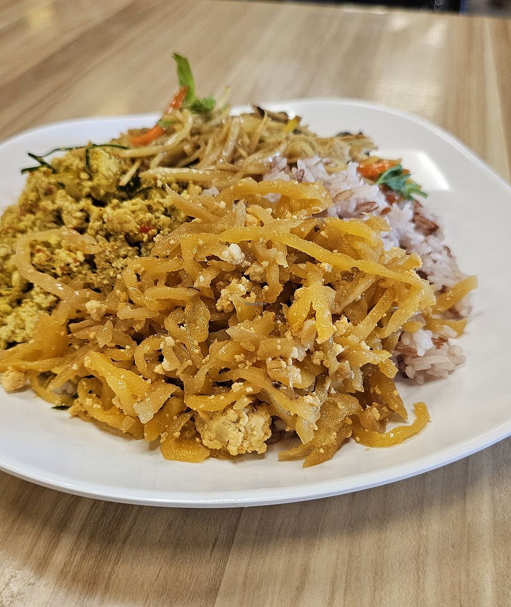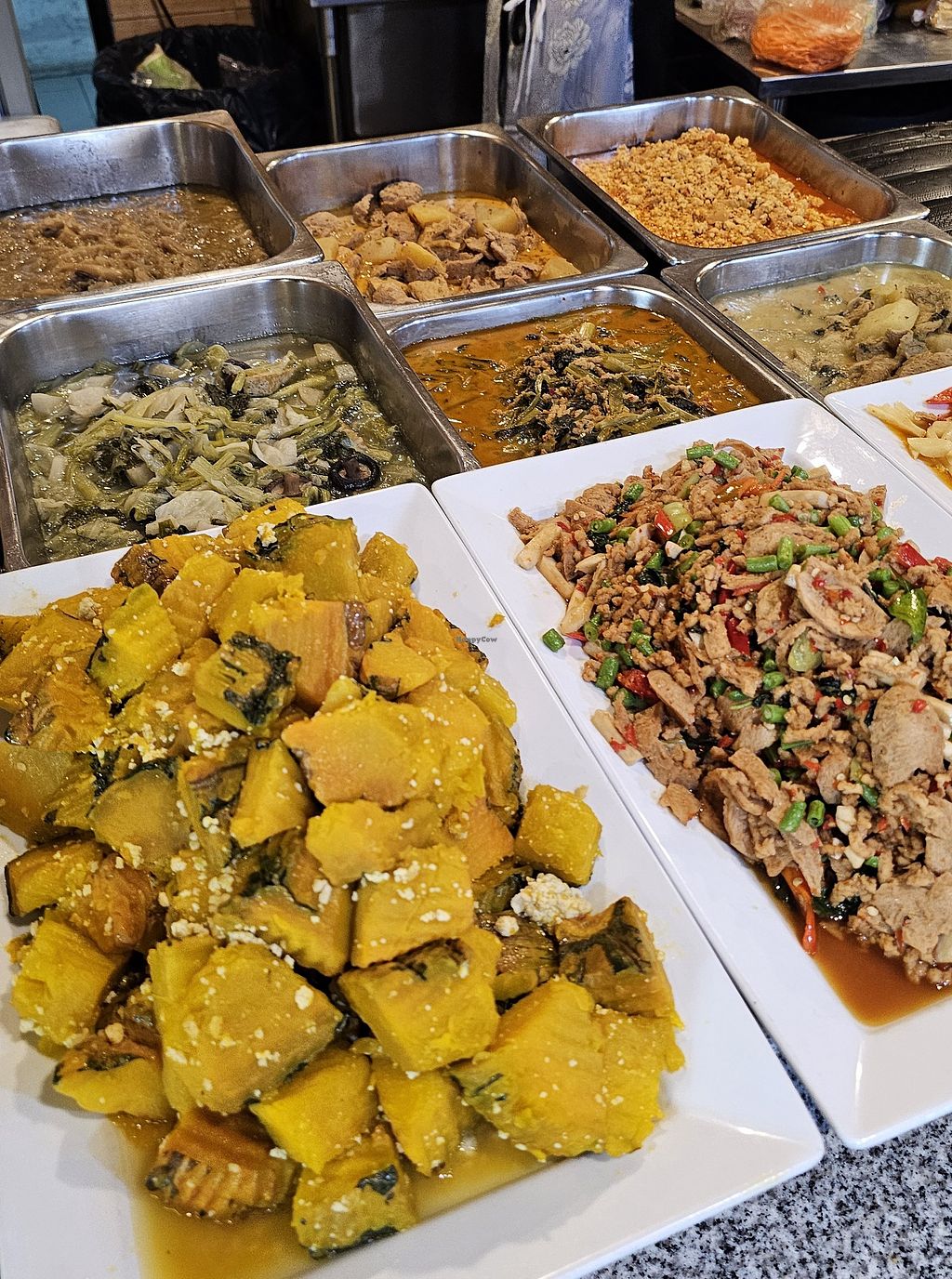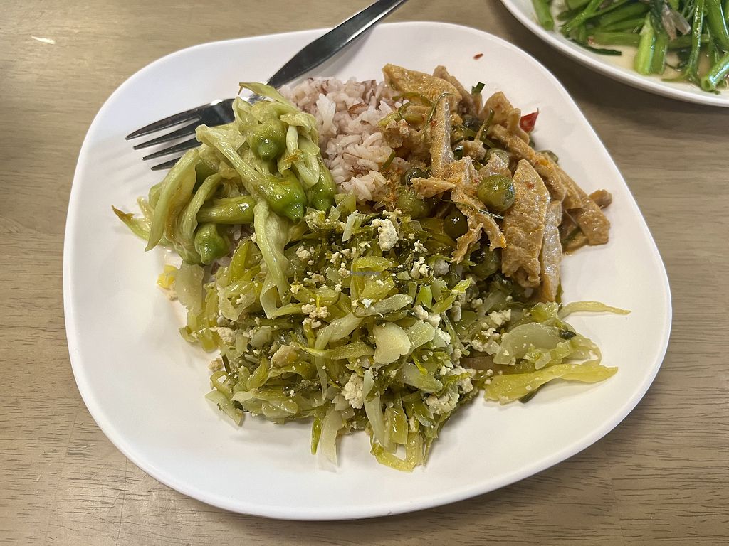 Variety of thai dishes. You can choose 2-3 kinds of side dish on brown or white rices (such as fried vegetables, green or red curry in coconut milk, chinese vegetable soup, fried eggs, crispy spicy sweet and sour mushrooms)