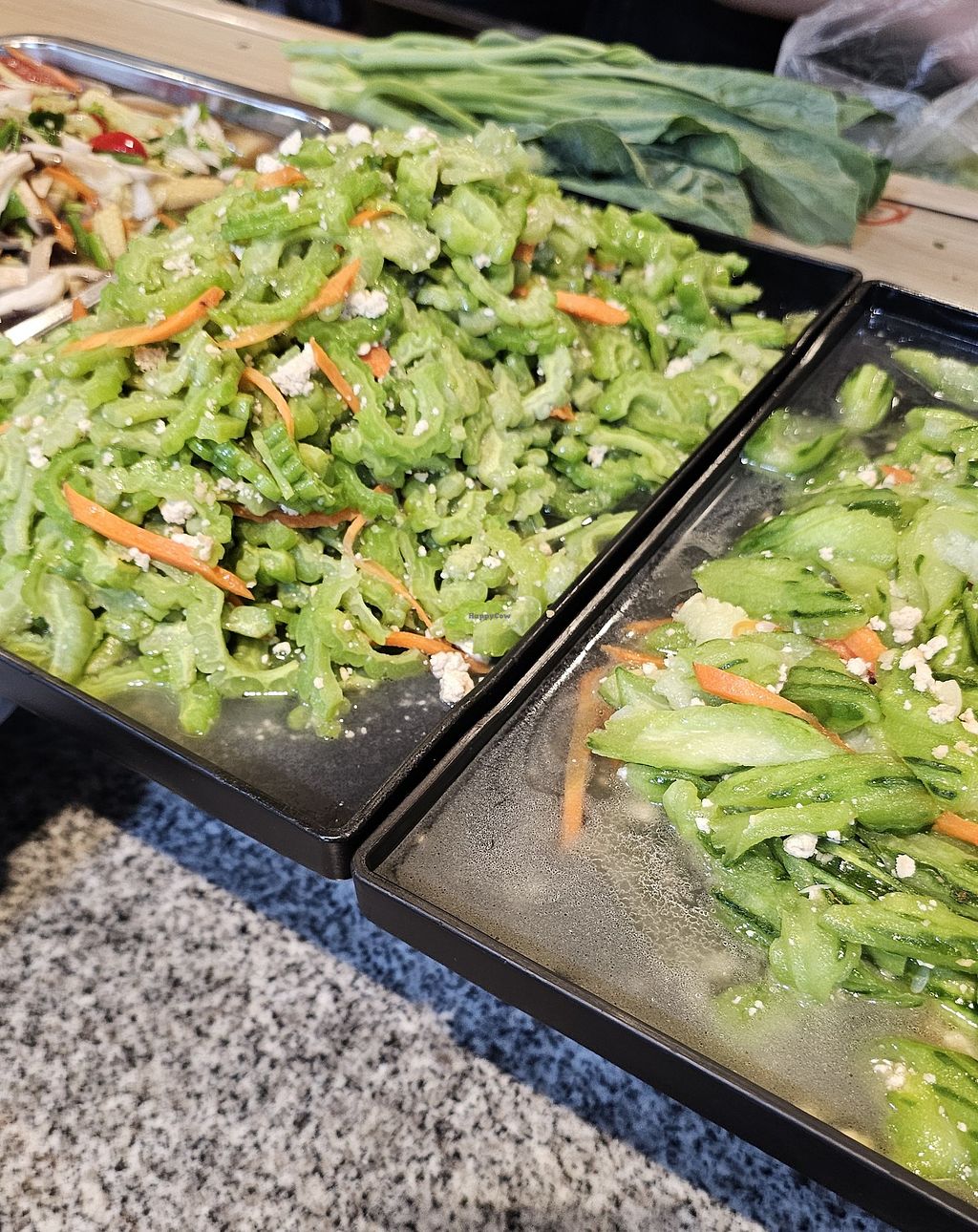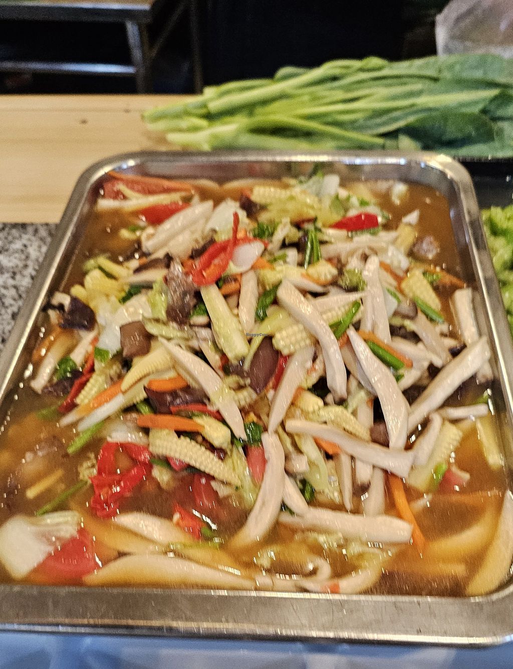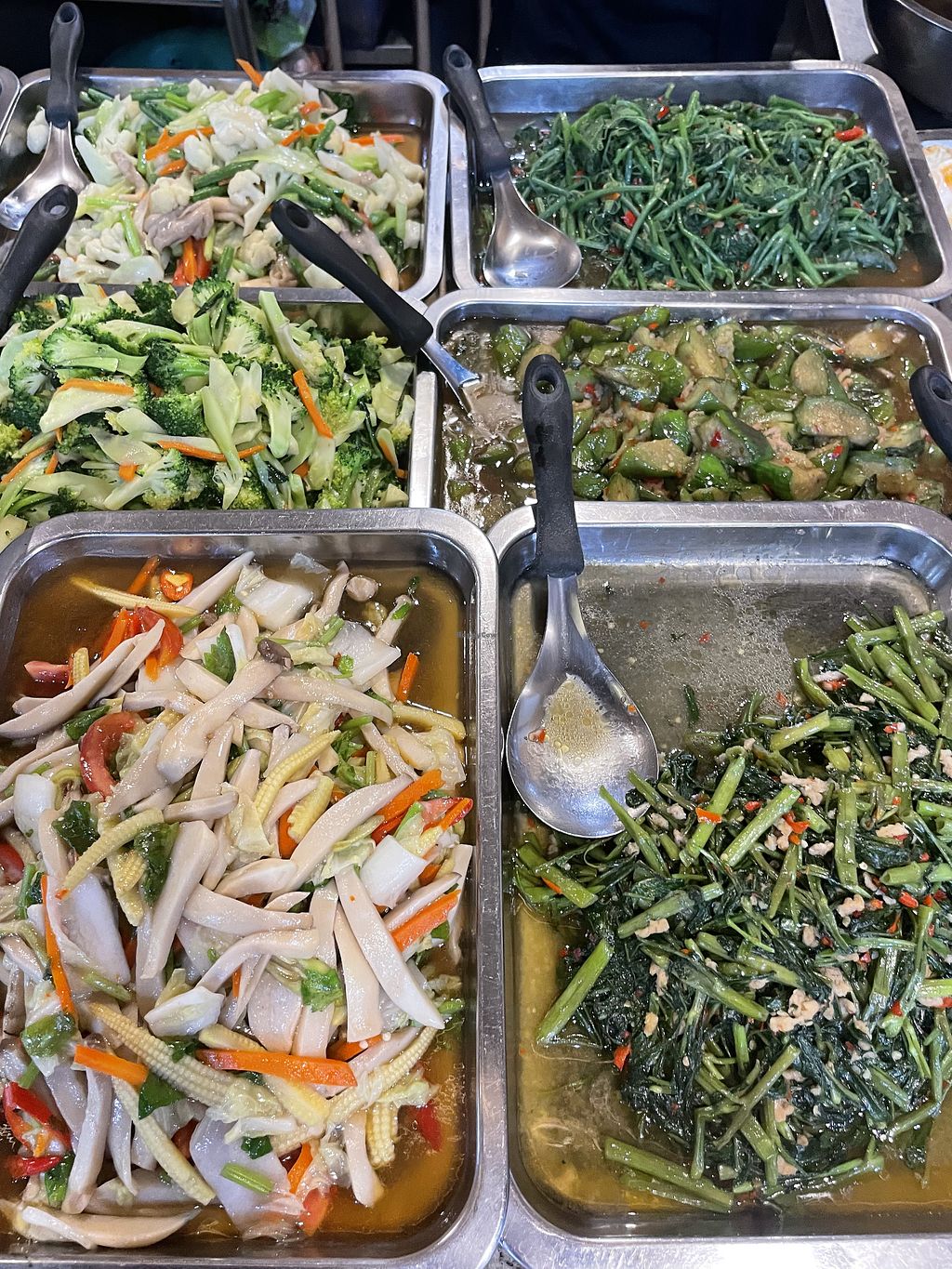 The food was alright. I tried five options. Two were tasty (but not fancy, simple and tasty). I tried what I think was batter-fried mushrooms, although it was almost entirely batter with the occasional tidbit of mushroom, not a fan. I also tried something that looked like mock meat, but it was hard, like eating chips, and not much flavor. So, you point to what you want and take your chances. I asked the person working there what she recommended, and she just said it's all good.