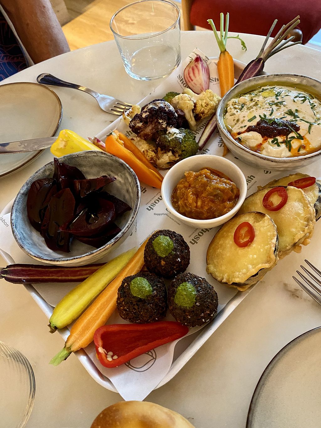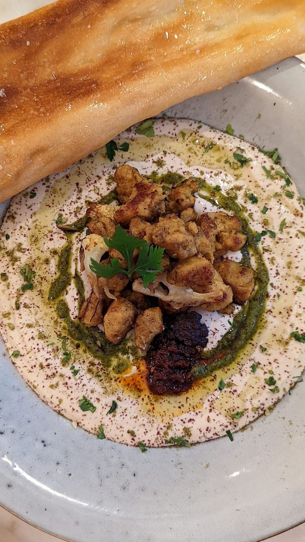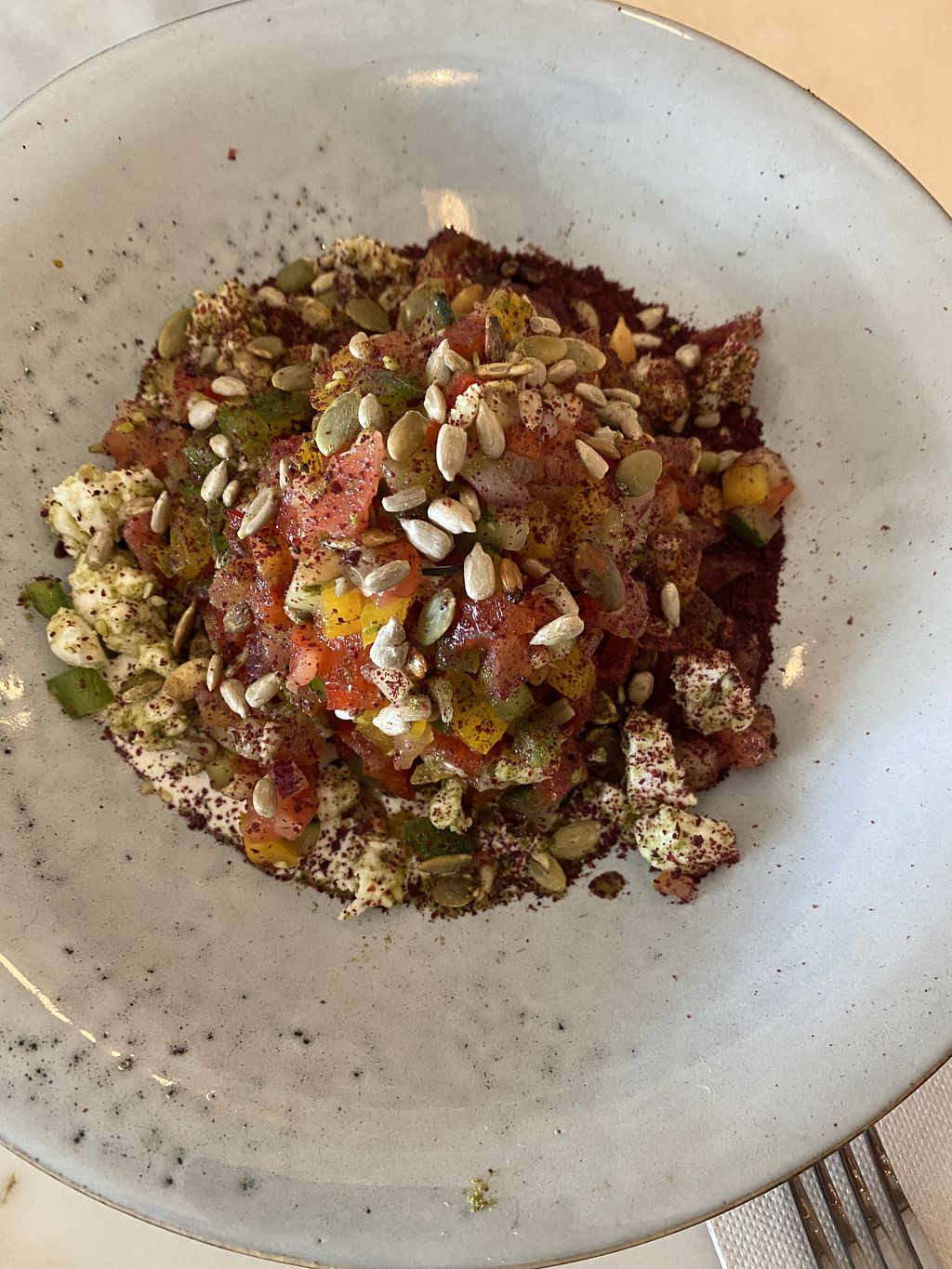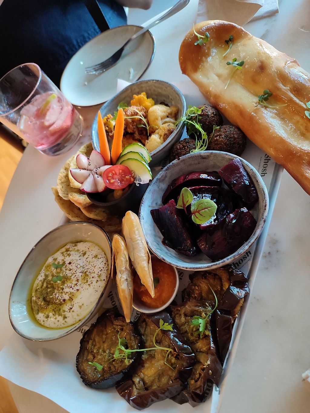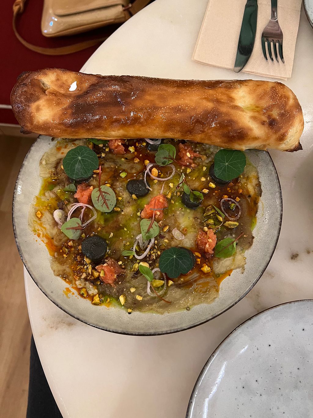 Though I don’t really understand the menu concept of this place (we were given a paper menu with a selection of a few dishes whilst the table next to us had dishes that weren’t on the menu?! There were no drinks on the menu so we didn’t choose anything but were given some water but we didn’t bother asking so that’s also on us) the dishes we ordered were suuuper good. We had the eggplant carpaccio and the hummus/falafel plate. The chocolate mousse for dessert was the cherry on top to finish the meal. Everything was very flavorful, different textures and spices. Very very good though a bit moee on the pricier side