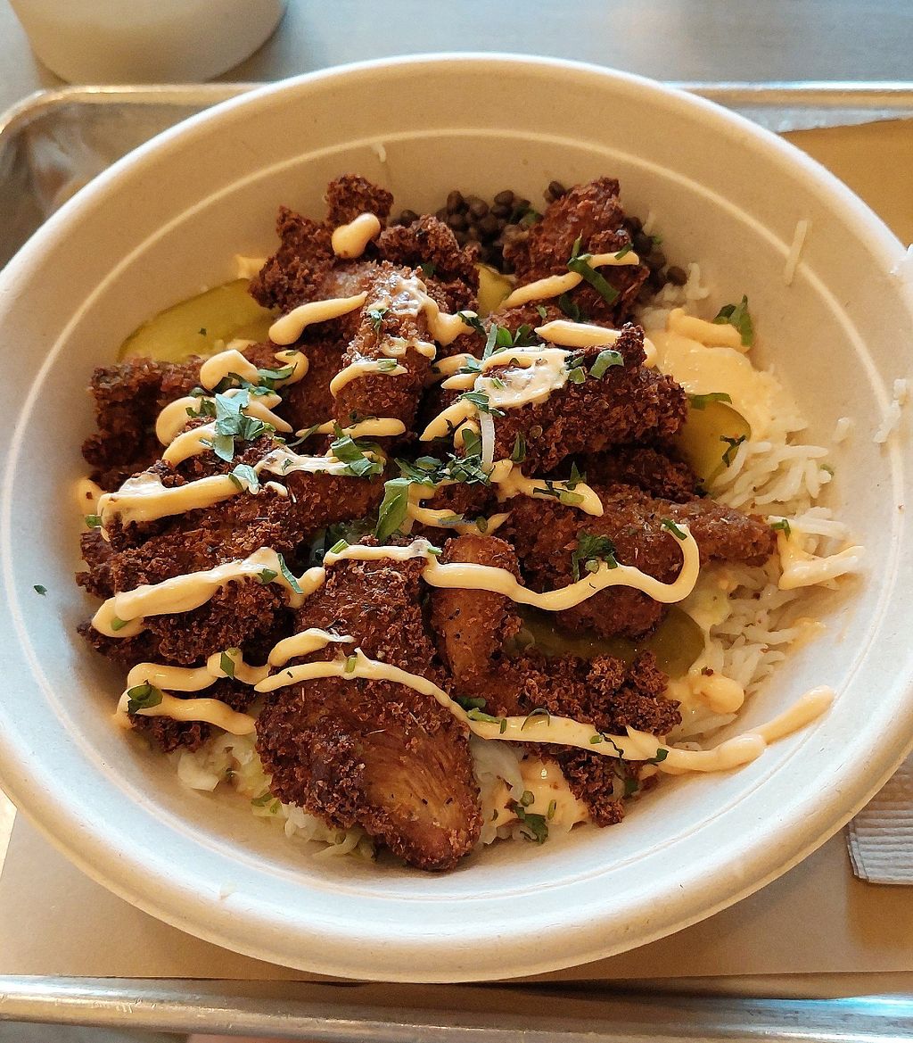 This branch is in a very nice location in Georgetown, so lovely to walk around this neighborhood! It has tables inside and outside and you place your order using a screen, no contact with staff needed. They have several options of sandwiches, bowls, and sides. I chose the Fried Shouk'n bowl and it was really good! It consists of oyster mushroom schnitzel, green cabbage, pickles, and harissa mayo. You can choose if you want it with rice and lentils, with salad, or both. Everything was very tasty, I loved the combination of the fried mushrooms with the sauce! Crunchy and fresh. They have two options of dessert: Malabi, which is a coconut milk pudding, and the Choco-Cardamom Cookie. I tried both of them and they were good, but nothing too special. I was craving something sweeter after the bowl and the desserts were a bit bland for my taste. But I would definitely recommend this place, the portions are big and the prices are fair. They have several locations in DC, so find one nearby and pay them a visit!