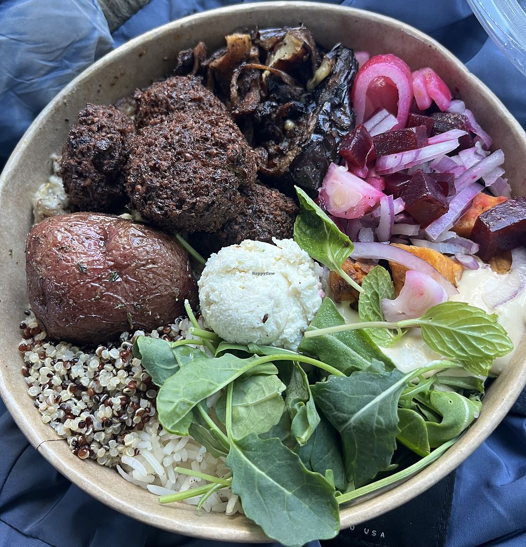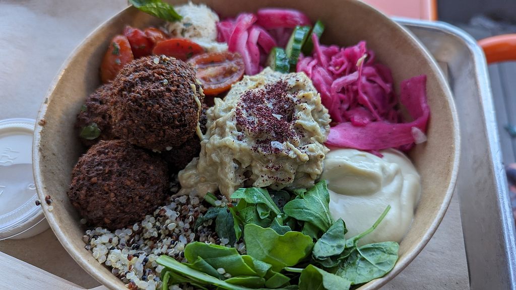 Vegan Israeli restaurant with several locations. Offers pita sandwiches, buns, bowls, sweets and sides. Examples include an oyster mushroom shawarma, JustEgg sandwich, za'atar cauliflower, falafel balls, hummus, cookies and more. Reported closed August 2024.