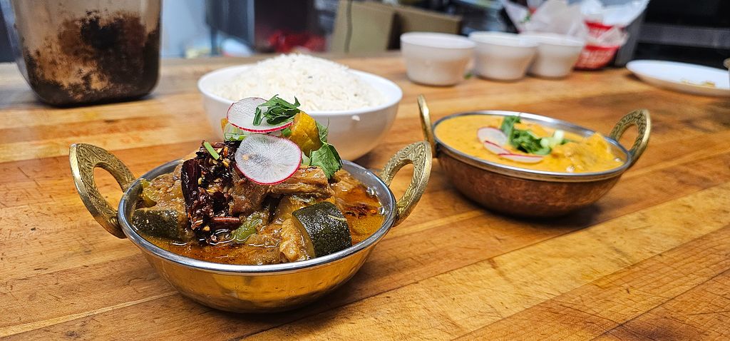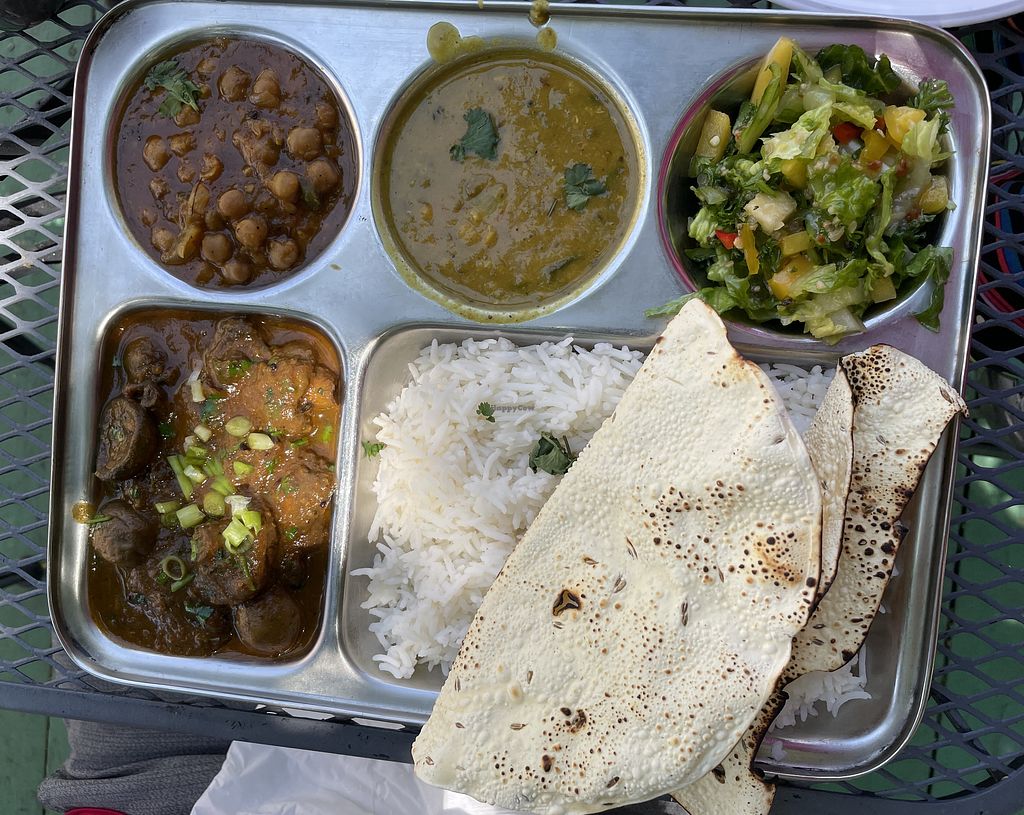 Serves meat, vegan options available. Quick-service Indian eatery with rotating combo plates. Has a vegan and omnivore plate every day, along with roti and dessert. Lunch is to-go only while dinner can be dine-in. Open Mon 12:00pm-3:00pm, 5:30pm-9:00pm, Wed-Sun 12:00pm-3:00pm, 5:30pm-9:00pm.
