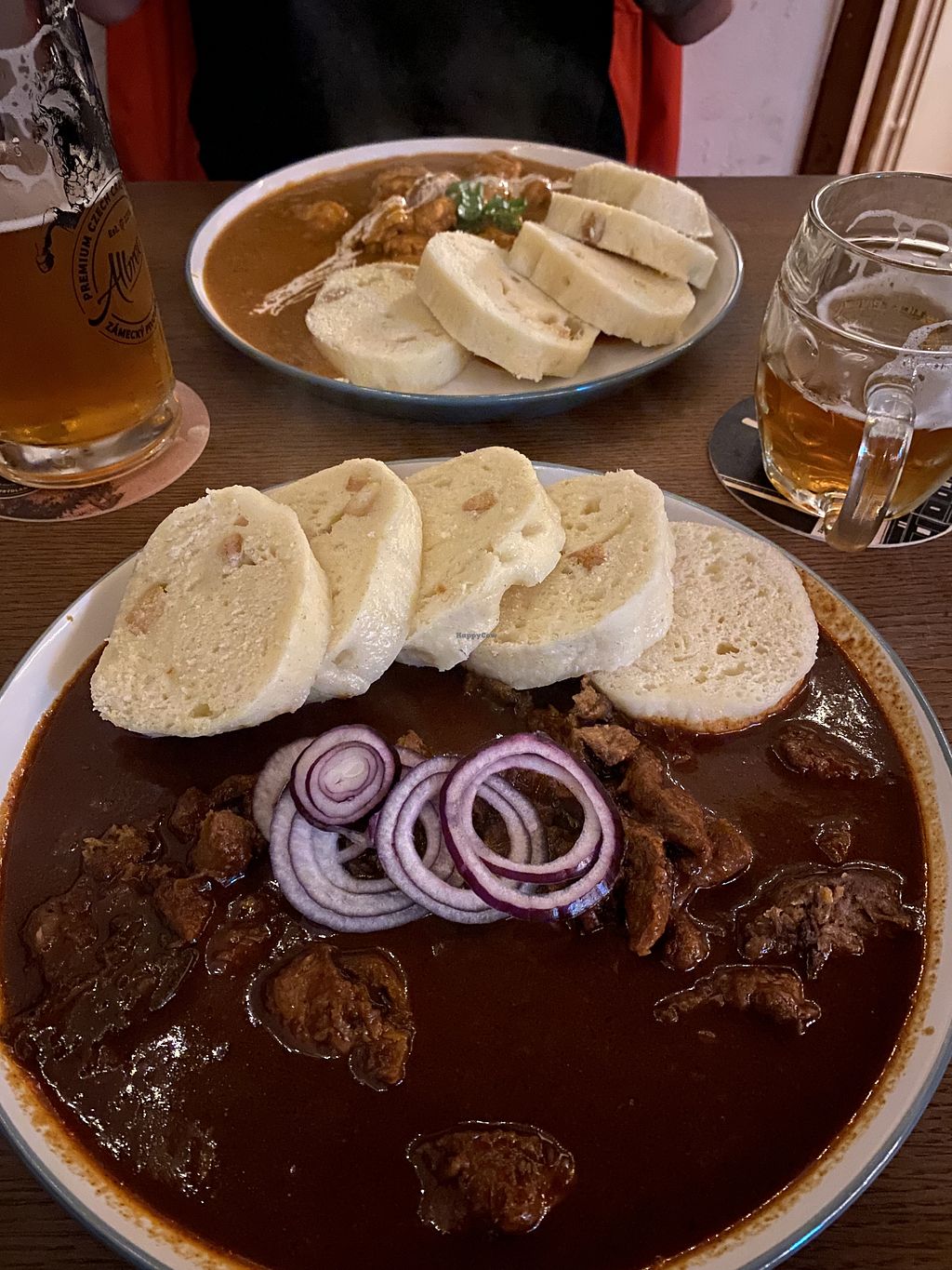 Výpečky - vegan soy "meat" pieces with gravy, sauerkraut, and knedliki…