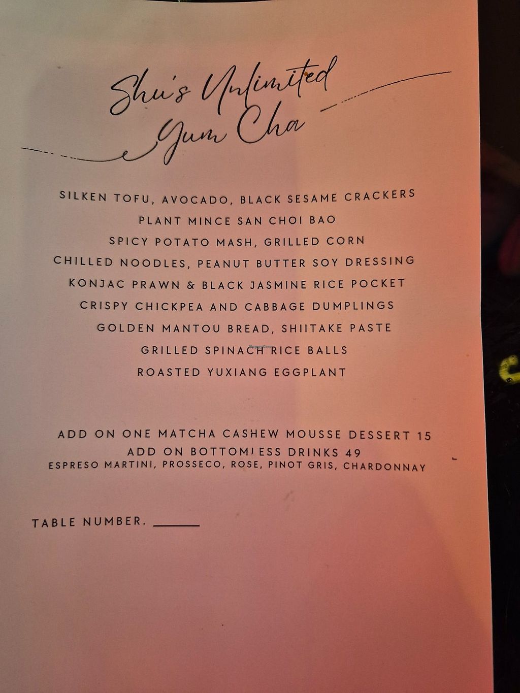 We came here to celebrate our birthdays, the four of us had a fantastic feast of 10 courses for unlimited yum cha. We were full after the courses but snuck in a few of our favourite courses because they were so good. So glad we went here. It was a perfect lunch. They do vegan well here. Played great music, cool decor and good selection of drinks. Will be back for for sure, maybe for dinner. And it was very reasonable- much cheaper than a fancier vegan place with creative tasty options. There was a Sunday surcharge, but the meals were so cheap that it didn’t matter.