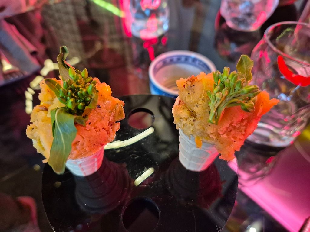Pros: Okra potato with crispy tofu wrap, Pickled kohlrabi with ginger pearls, Charred Chinese broccoli