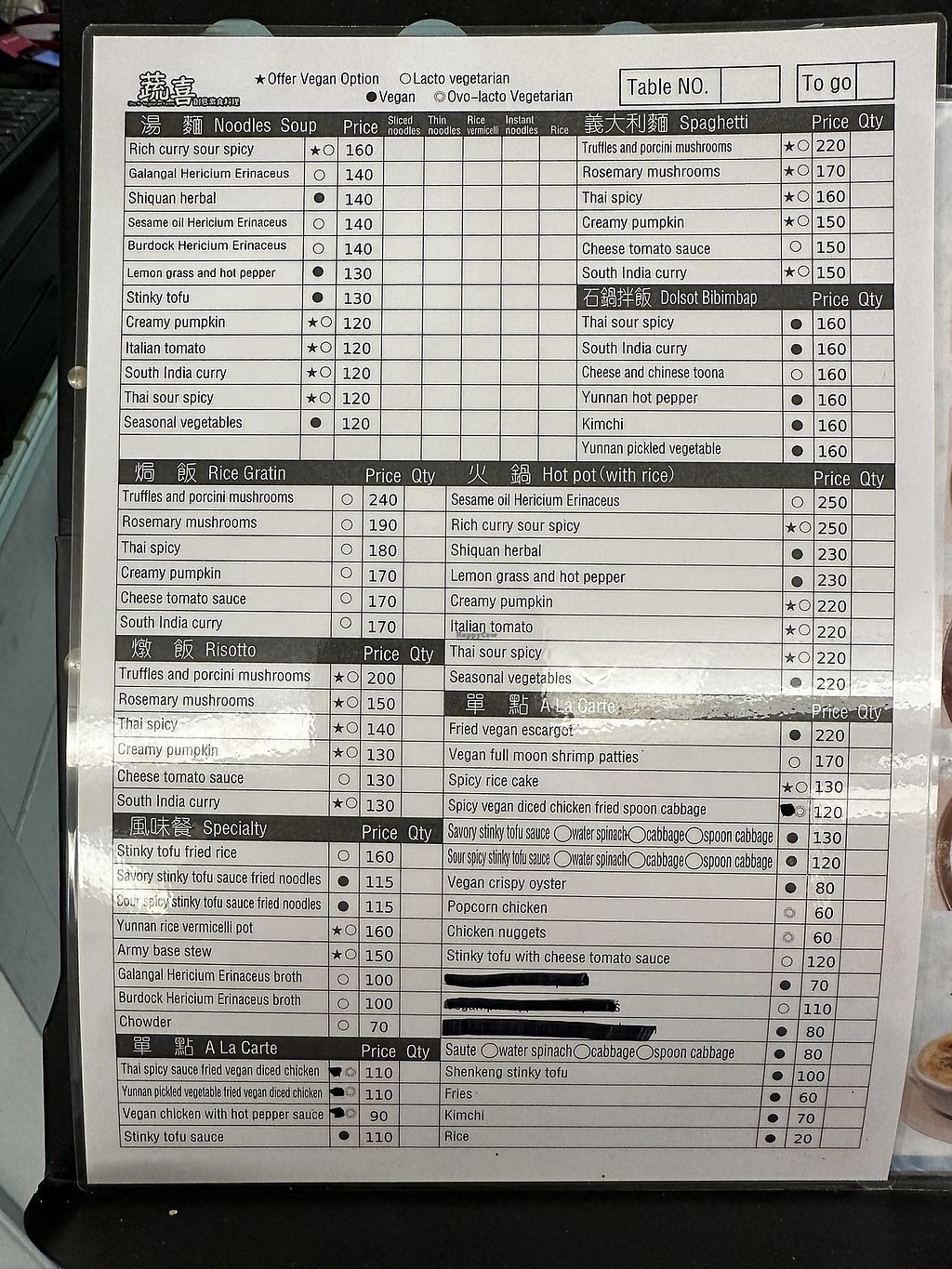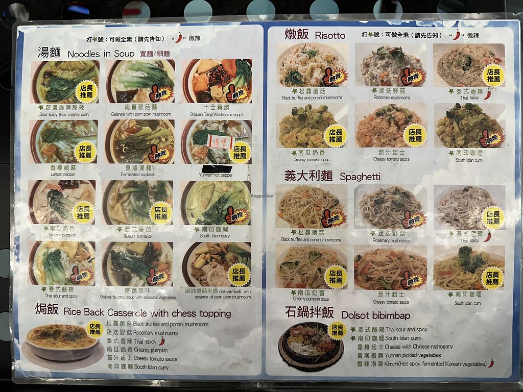 Casual restaurant that serves a mix of eastern and western style vegetarian dishes. Menu offers pasta, risotto, Taiwanese soup noodles, rice and vegetables in claypots, and hotpots. NOTE: Maybe closed June 2025 - please send updates to HappyCow. Open Tue-Sun 11:00am-2:00pm, 5:00pm-9:00pm. Closed Mon.