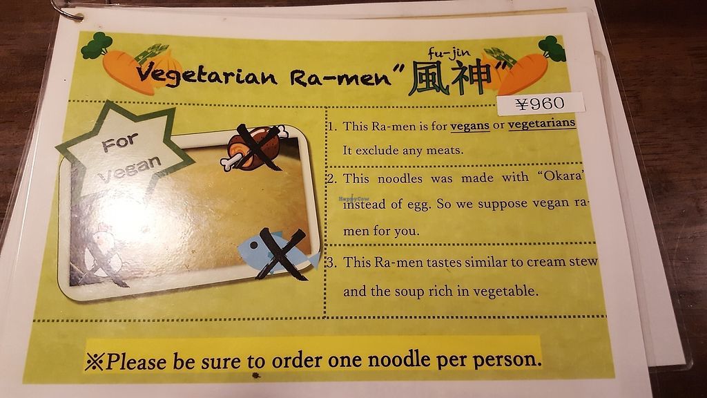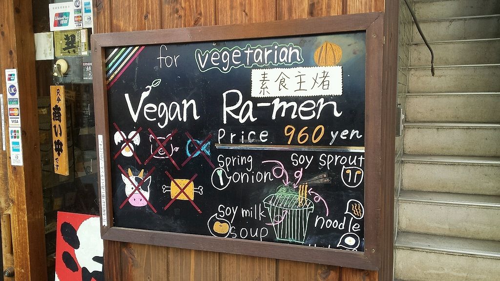 This was my first day in Osaka and I was very happy to have found this place thanks to happy cow! There was an English menu and the vegan ramen (made with okara) was clearly marked. The food was delicious and I really enjoyed the atmosphere in the place too.