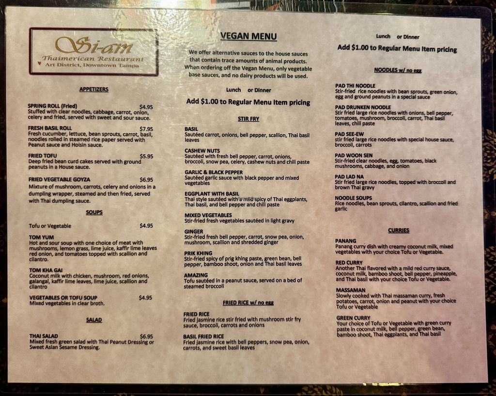 i was so excited to try it here because i heard they were very accommodating to vegans. i tried the penang curry and got a side of brown rice. definitely was some of the best food i’ve had in tampa. the flavors were amazing and portions were good but not overwhelming. i recently for their pad thai and it was good, but not the best i’ve had. next time i’ll stick with their curries. however on the pickup receipt they handwrite vegan on the order each time, which is a big green flag and makes me feel assured that the food i’m getting is vegan.
