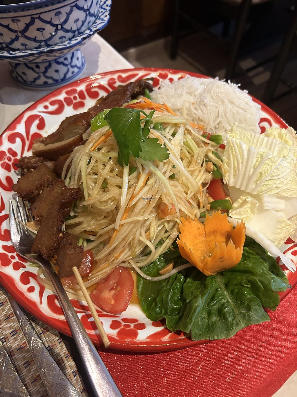 Ich habe noch nie eine so große vegane Auswahl gesehen. Das ist wirklich positiv hervorzuheben. Die Gerichte findet ihr in einer separaten veganen Karte. Ich hatte Som Tam und eine vegane Tom Kha Gai Suppe. Leider war die Suppe eher eine einfache Kokosmilchsuppe, ohne die typischen Zutaten wie Zitronengras, Kaffirlimettenblätter oder Galgant. Der Papayasalat war geschmacklich gut, mir hat jedoch die Schärfe gefehlt. Insgesamt wirkte er etwas „eingedeutscht“. Wer eine riesige Auswahl sucht, ist hier richtig, aber geschmacklich könnte es authentischer sein.