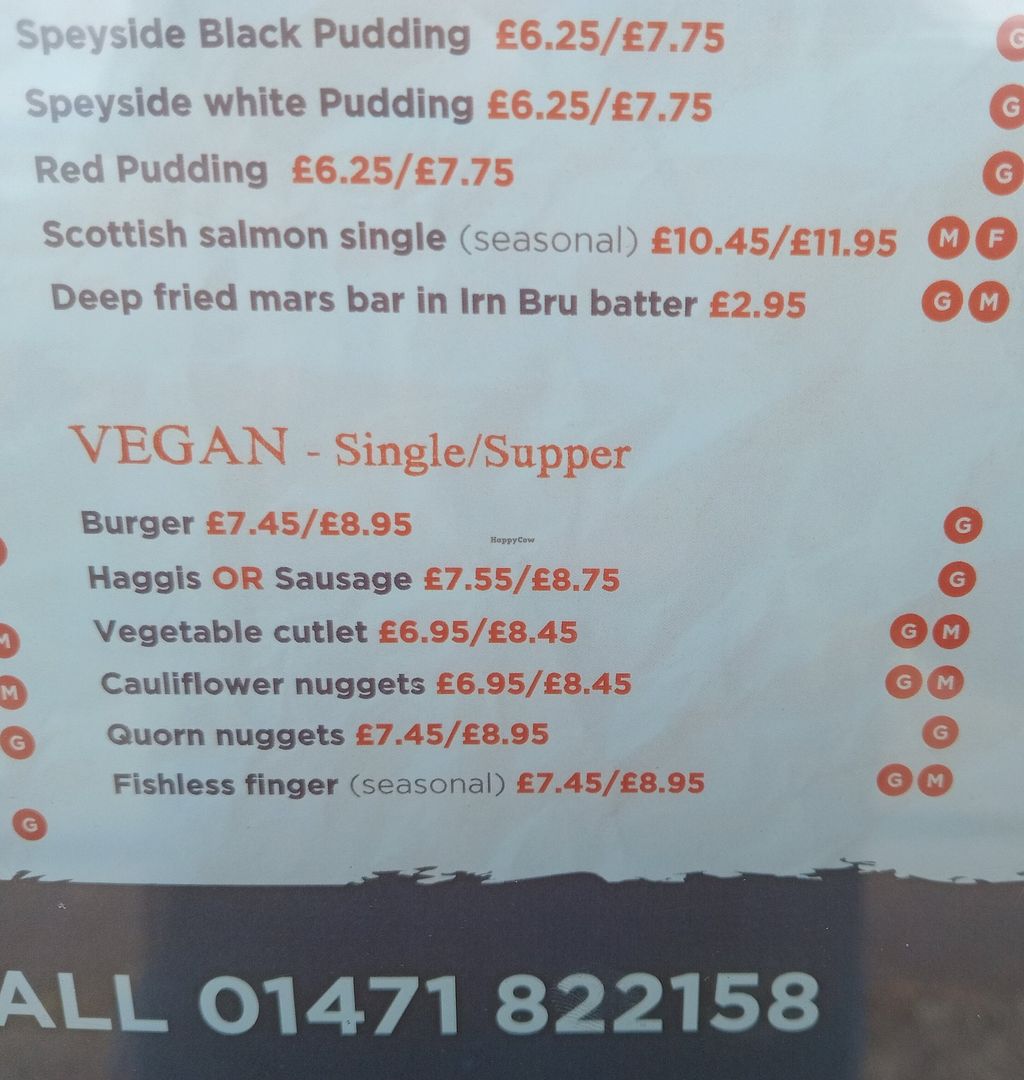 They have vegan burgers, sausages, haggis and nuggets. The food itself isn't brilliant (maybe thats what a real chippy tastes like, I honestly don't know), a bit on the greasy side but overall glad it was there when we were hungry. Staff seems to know what is vegan and what is not