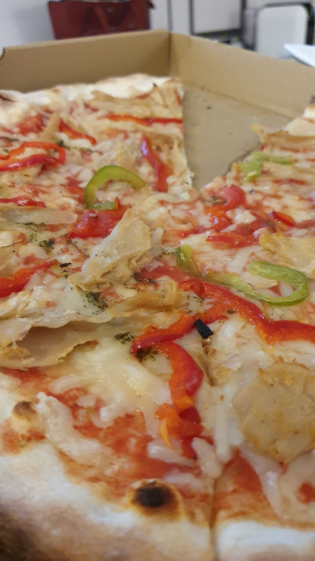 Tomate, mozzarella vegana, tiras de heura, pimientos.