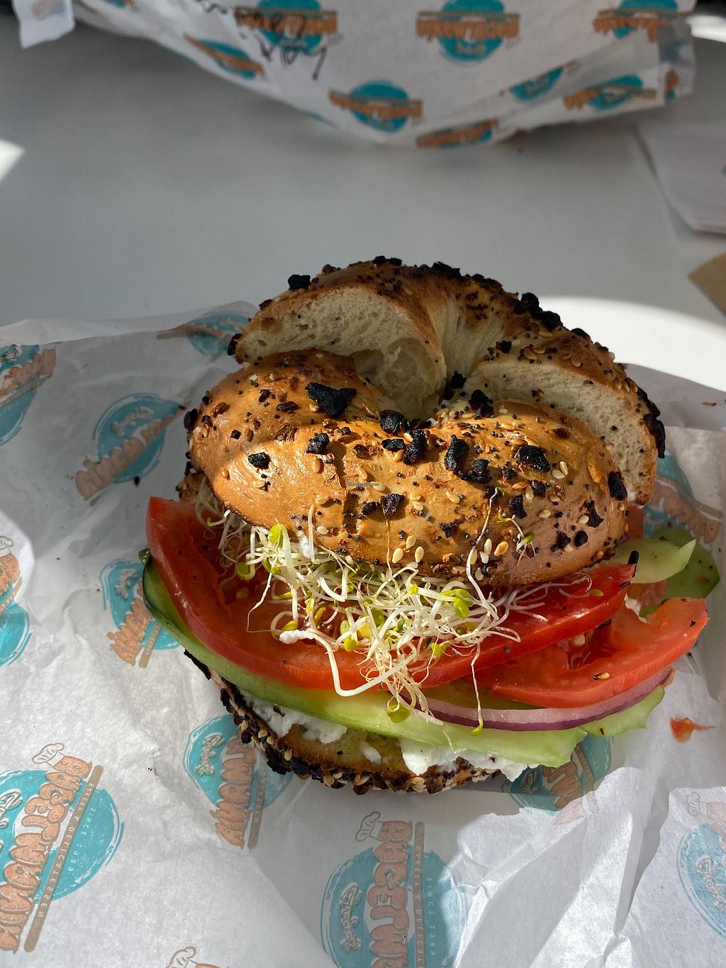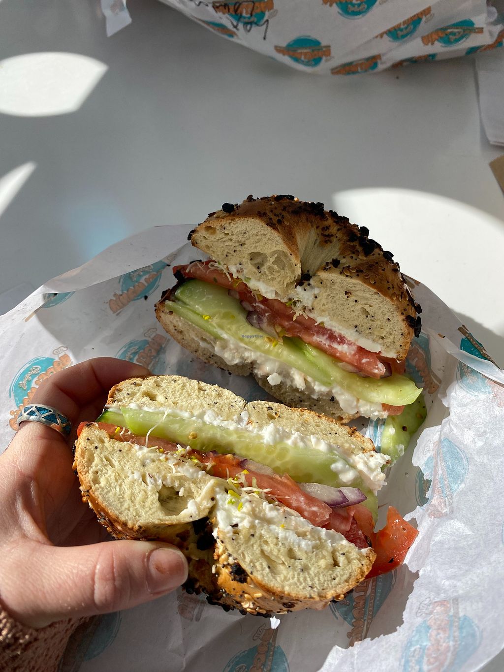 Toasted everything bagel with plain vegan cream cheese, tomato, cucumb…