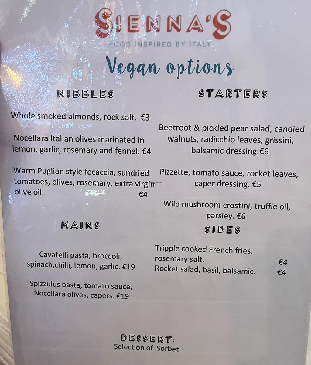 Came hero as saw they had a vegan menu. Was a bit disappointed the waiter didn't ask us if we wanted drinks while looking at the menu so we just ordered drinks when ordering our food. Really enjoyed the starters of crostini and the honey dew salad, which doesn't sound like the flavours would work but they really did. There's two mains so we ordered one of each. The arrabiata wasn't as spicy as expected and was quite nice. The green pasta itself was nice with the vegetables but had no sauce on it so that made it quite bland. I really think this dish could be improved if a sauce or marinade was added. Wine isn't labelled vegan friendly etc on the menu but Googled and there was a couple that were vegan friendly which was good.