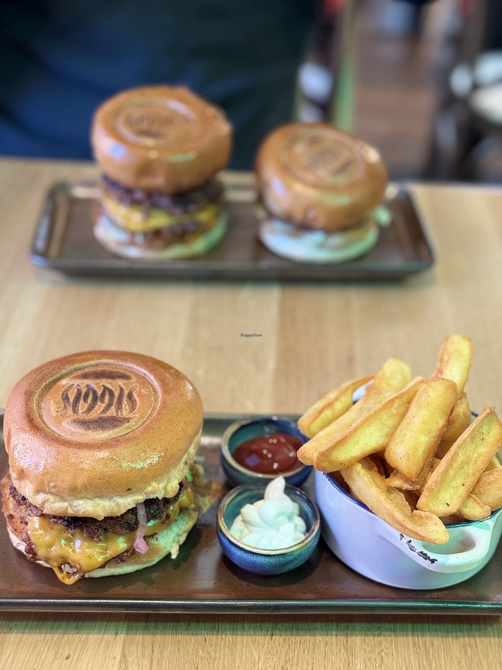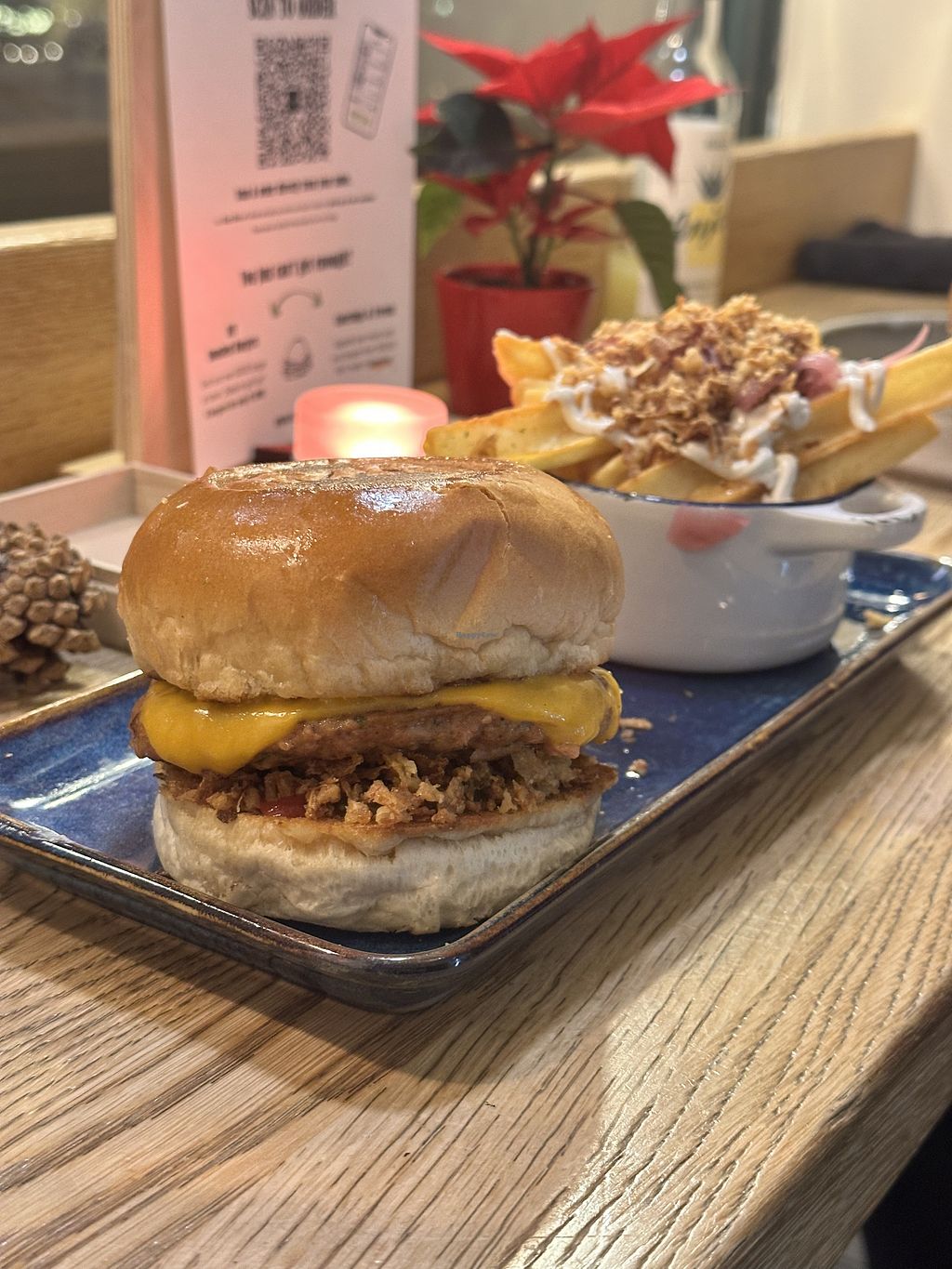 The restaurant offers a variety of vegan smash burgers with sides. The star of the show is the bun. Overall, a clear 6 out of 5.