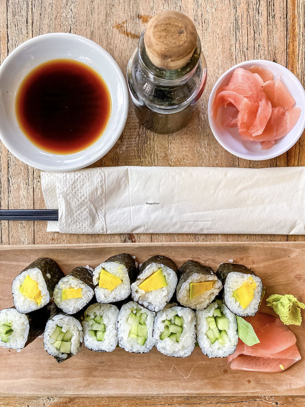 Serves meat, vegan options available. Small sushi and poke restaurant with vegan choices. Menu includes vegan avocado maki, cucumber maki and veg lover roll topped with mango and chili sauce. Poke bowls can be made vegan upon request. Open Mon-Sun 11:30am-10:00pm.