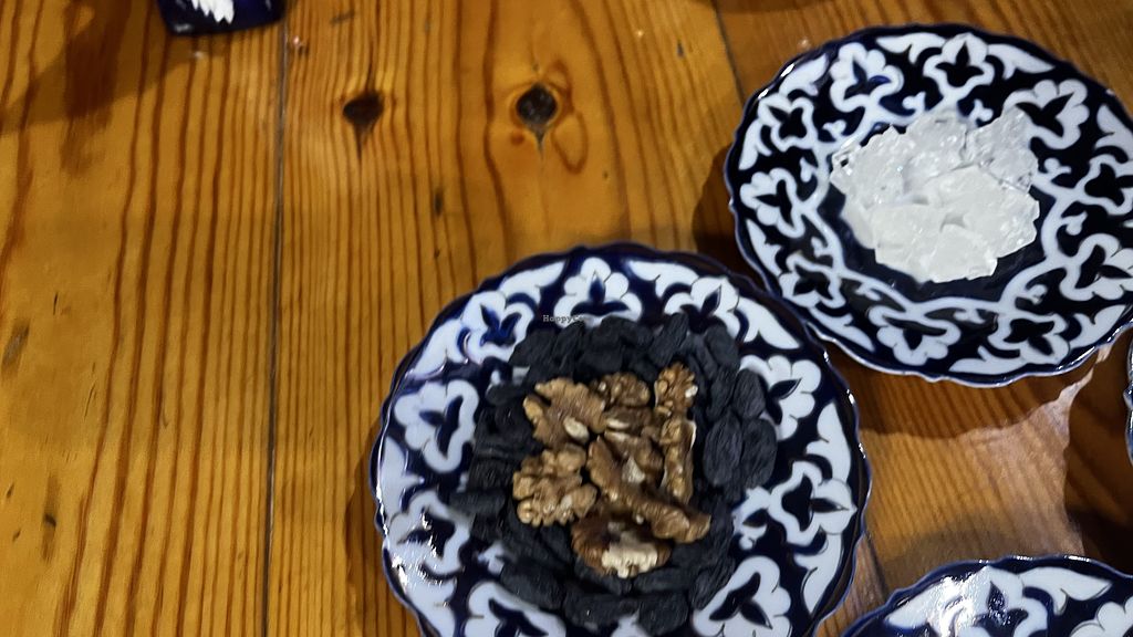 Read moreThey are served with complimentary raisin and walnuts, a plate of sugar paste (confirmed vegan), and a sesame candy (which is not vegan, contains honey).