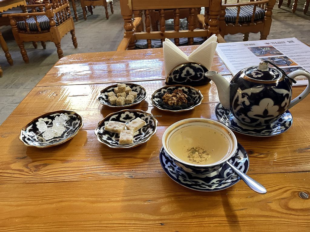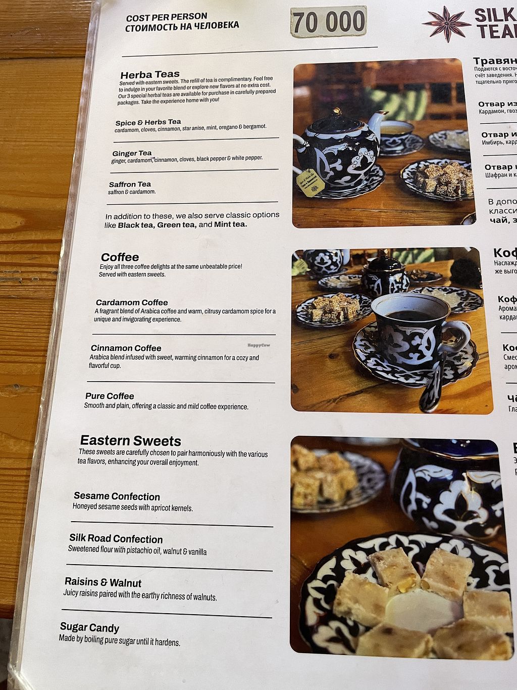 I think I went here too early as it had just opened and I was the only one in there. No music was playing until about half way through my drink. Nice decorations but I would suggest going a bit later when there’s more people. The sesame sweet is not vegan. 70,000 UZS for set drinks and sweets