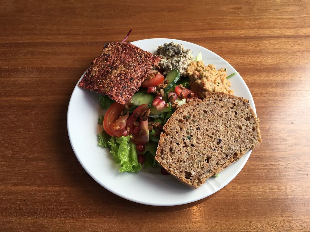 Vegan vegetable ginger soup with bread and flax crackers