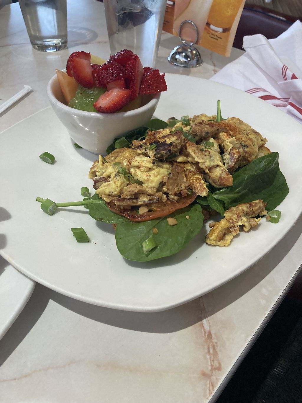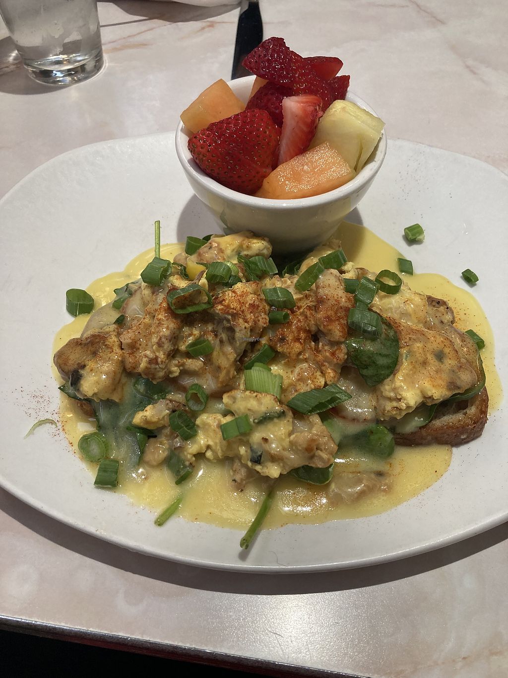 Just Egg Benedict with fire roasted tomato, vegan cheese sauce, tempeh…