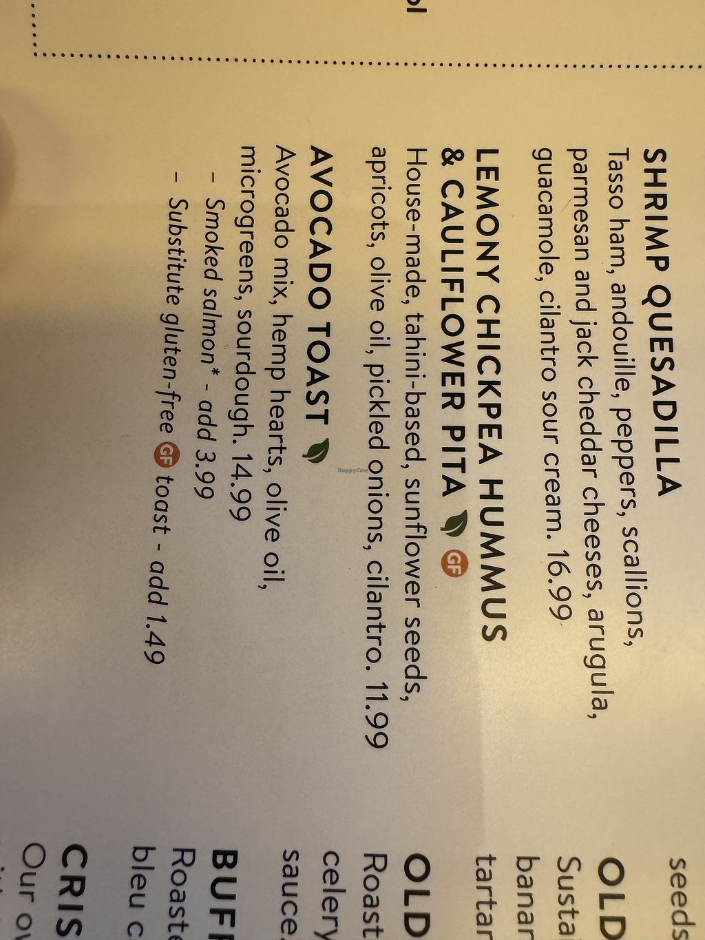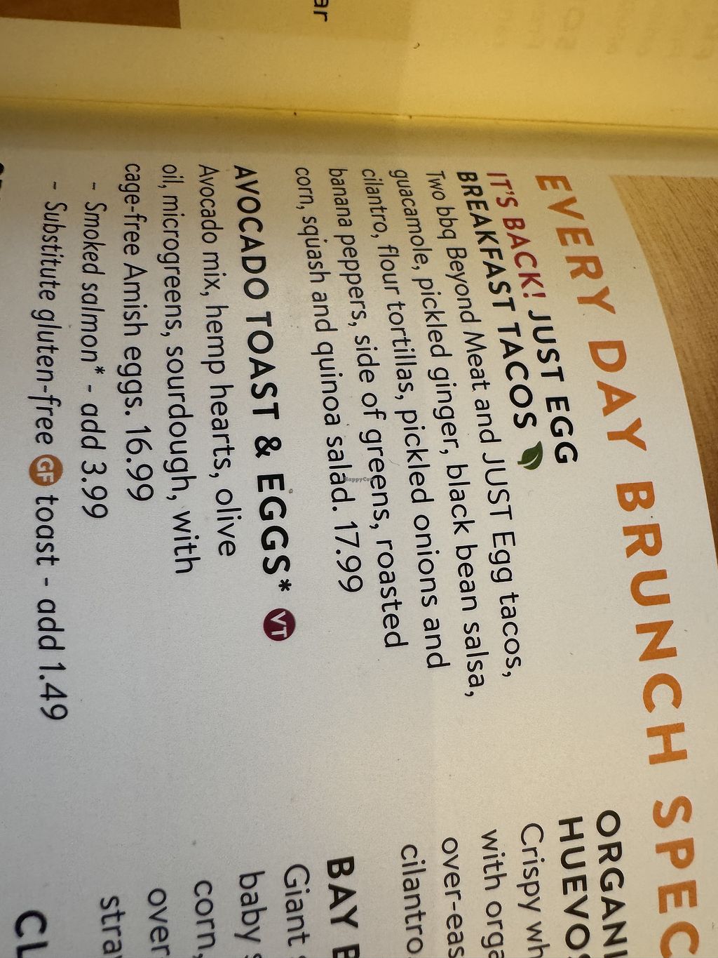 Great options that have flavor. Had the eggs benny and my daughter had the pancakes. They also have an egg taco, bowls, salads, and standard stuff like fruit.