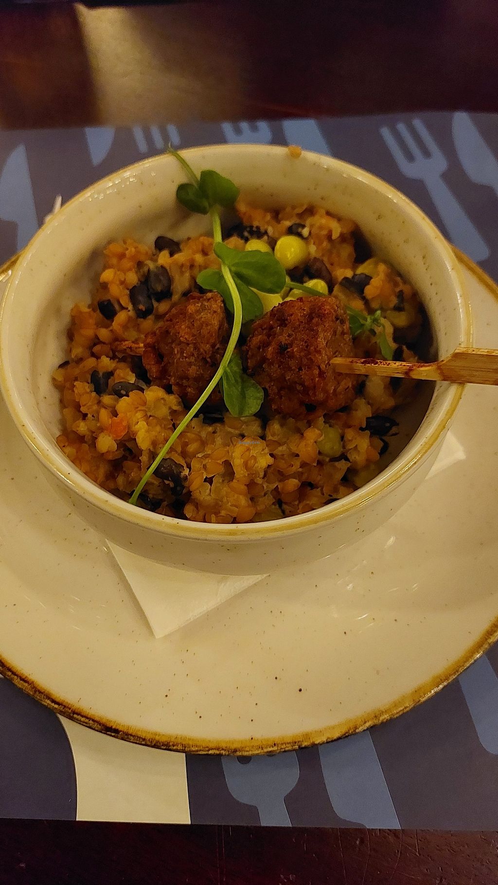 The 3 course was delicious. Started with a salad with faux meat chunks, beans and avocado. Main course was a skewer with beyond meatballs and veggies and the dessert was special but I liked it. Staff was super friendly, complimented my outfit and fixed my mistake (I came too late for my reservation due cue’s). It’s was very busy so the wait was pretty long before we got our food but that is pretty normal.