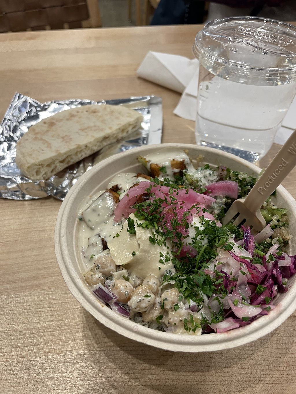 They have options that are labeled as vegan or as “can be made vegan upon request”. I really liked the food I got there—it was very flavorful! The employees seem quite knowledgeable about veganism so I wouldn’t hesitate to do the create-your-own dish option and ask any questions that you have (although I haven’t done that yet—I had one of the labeled vegan-option dishes). The baklava was labeled as vegan and when I asked they said that includes no honey. I also got some hummus to-go from there one time, and that was so good…it felt like a kind of small portion size but I think that’s just because it was so delicious!