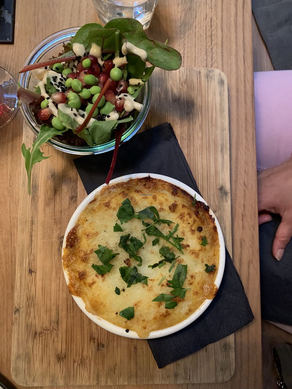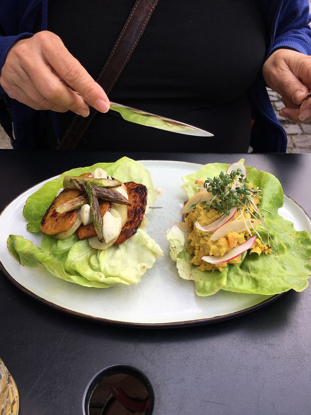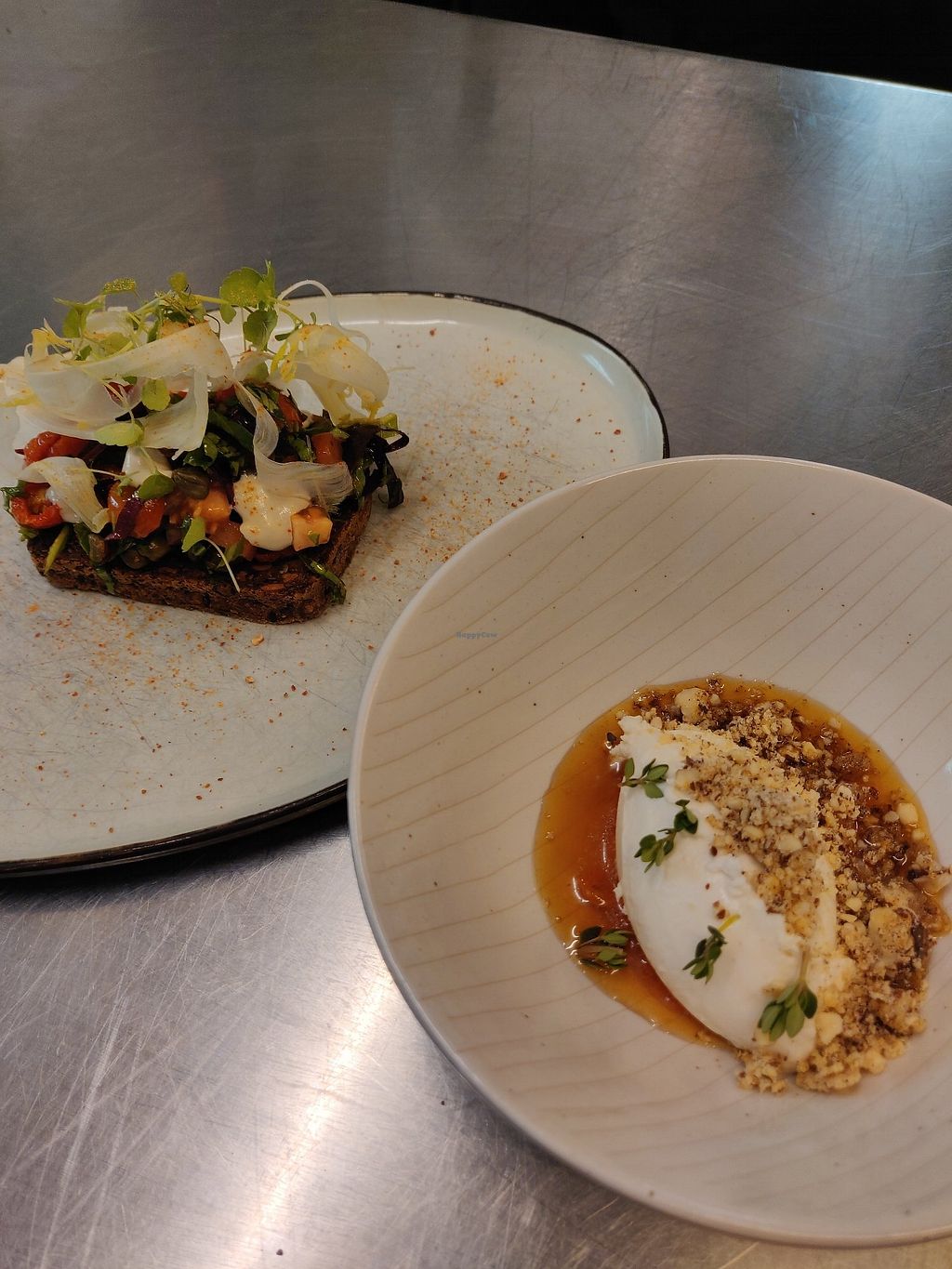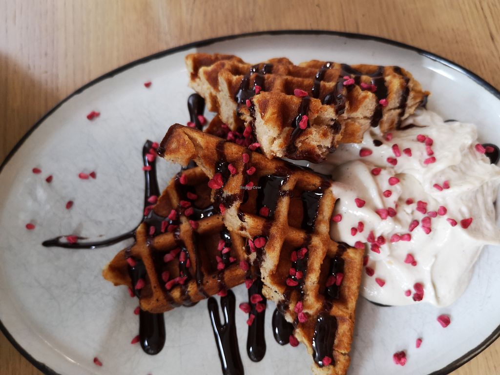 Smørrebrød with tempeh and dessert waffles with cream and berries. SO …