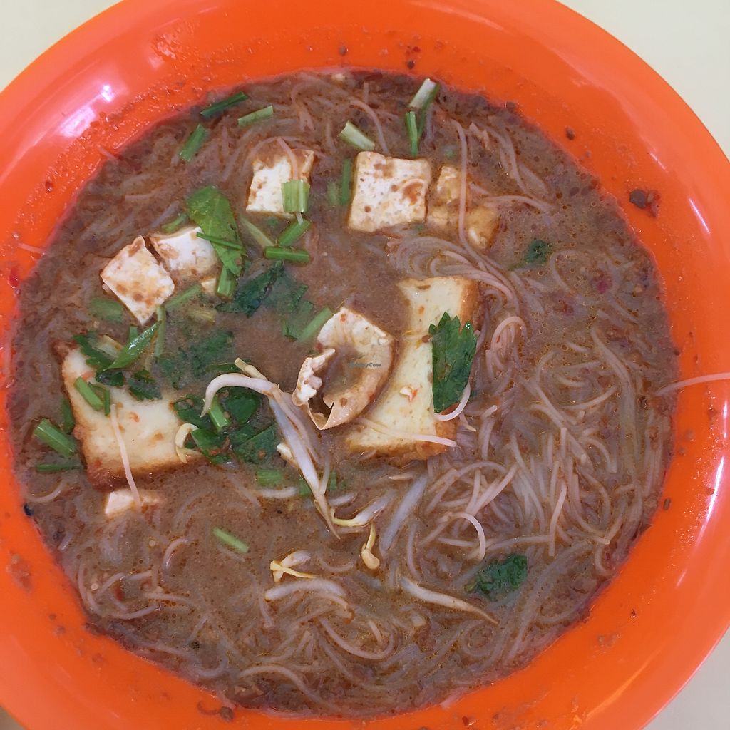 翔一素食 vegetarian hawker stall serving mee siam, mee rebus, dry noodles, and other dishes. Egg can be omitted on request. Reported closed, Jul 2018.
