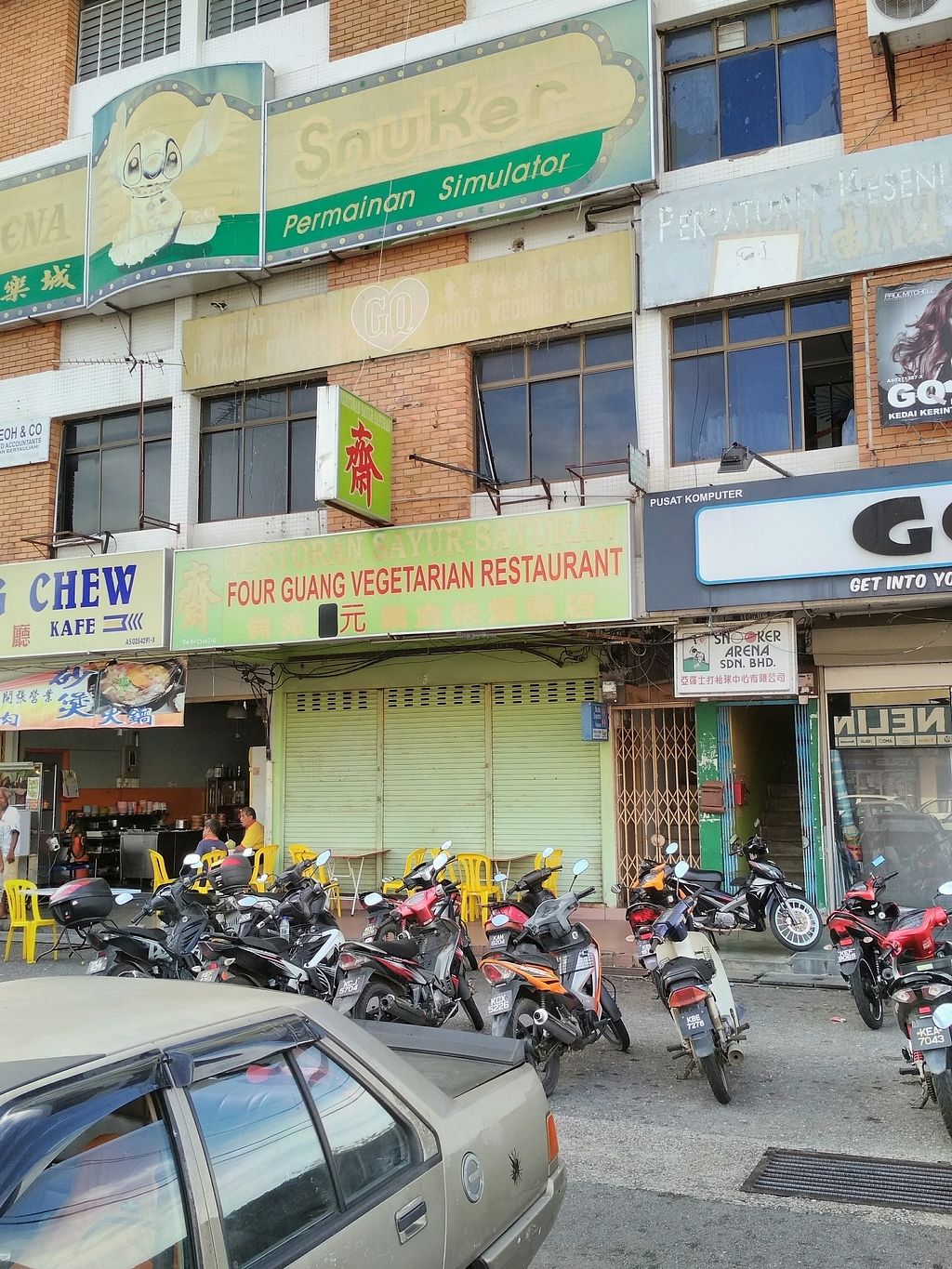 Located behind the Star Hotel. It is RM2.50 for a 3-course rice meal. Same price for wanton mee, koay teow soup and more. Name in Chinese: 佛光2元素食快餐通店. Previously called Four Guang Vegetarian Fast Food. Open Mon-Sat 8:00am-3:00pm.